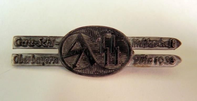 NAZI SS-SA COMPETITION-1933-GAU-SCHI-OBERBAYERN-MEISTERSCHAFT TOLZ 1933 AWARD---PIN BACK VERY SCARCE--MUCH PATINA--LARGE CENTER OVAL WITH SA (STORMTROOPERS) ANS SS LOGO.--APPROX 2 1/4" WIDE