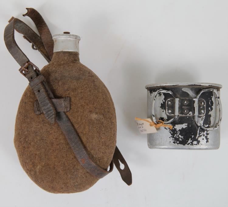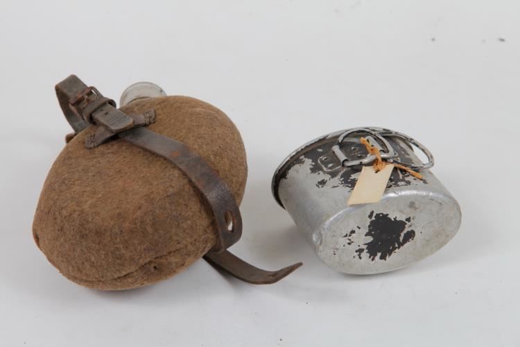 NAZI WEHRMACHT CANTEEN WITH STRAPS--MKD "HRE41" GRAR-GREEN WEHRMACHT WOOL--CAP MAKER MARKED--STRAPS PRESENT WITH CLIP-AS PICKED UP FROM BATTLEFIELD BOTTOM RETAINING STUD NOT PRESENT--STRAP TO CAP BROKEN-WITH CANTEEN CUP
