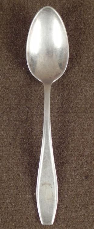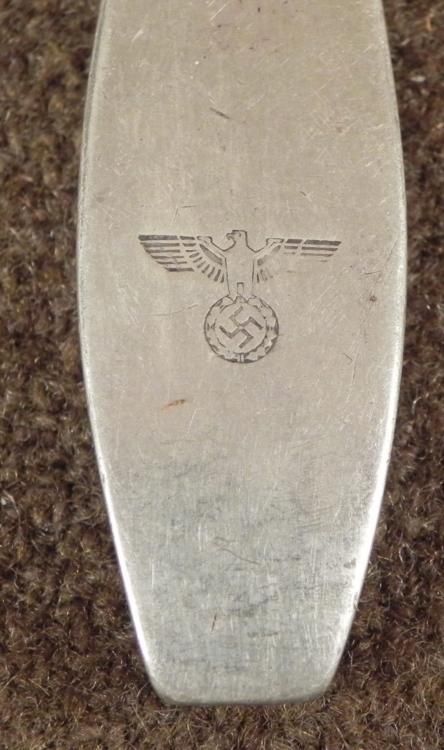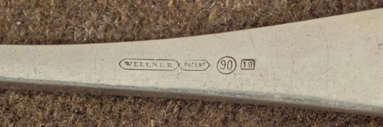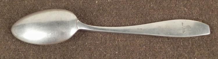 NAZI WEHRMACHT DINING HALL SPOON-EAGLE & SWASTIKA & MAKER MARKED-WELLNER (HITLER'S PERSONAL SILVERSMITH) * 5 5/8"---EAGLE & SWASTIKA ENGRAVED--ALSO MARKED "WELLNER PATENT 90 18"--WELLNER WAS HITLER'S PERSONAL SILVERSMITH *