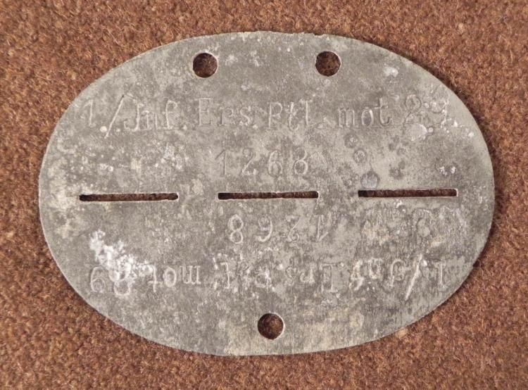 NAZI WEHRMACHT DOGTAG-1ST INFANTRY DIV BATT.1-MOTORIZED 29-#1268-ORIG COMBAT PICK-UPIMPRESSIVE VET BATTLEFIELD PICK-UP-NAZI WEHRMACHT DOGTAG-BOTH SIDES-SHOWS MUCH AGE, ESPECIALLY ON REVERSE