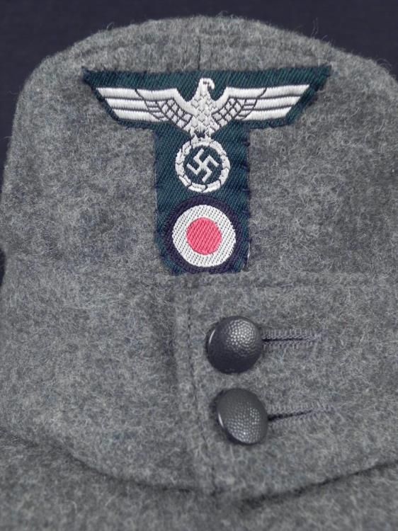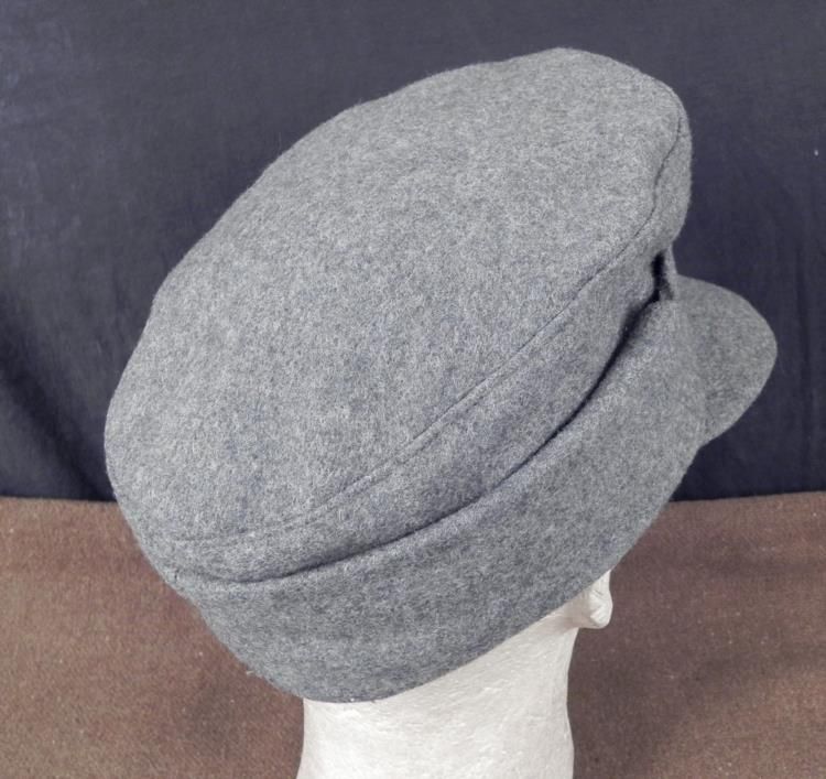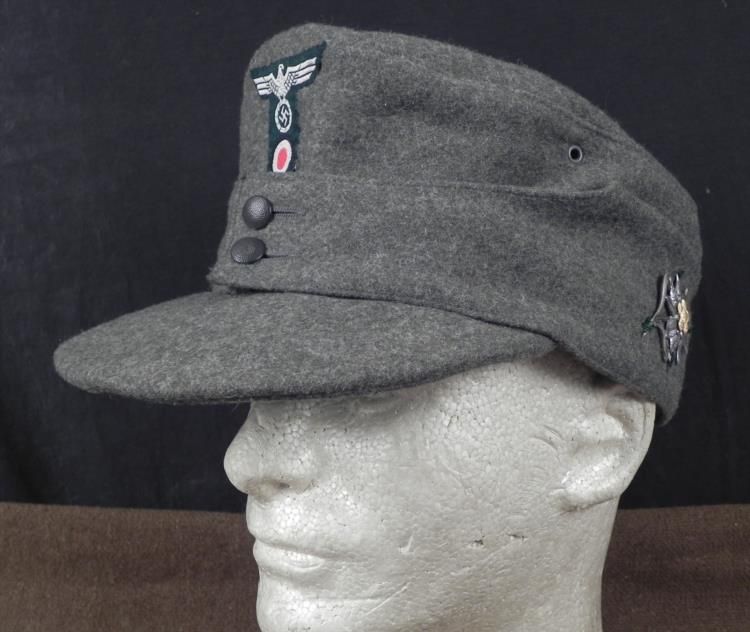 NAZI WEHRMACHT M43 BERGMUETZE/MOUNTAIN TROOPS * * VINTAGE NAZI M43 MT. TROOPS CAP -HAS "T" SHAPED EAGLE/SWASTIKA/COCKADE IN FRONT--2 FRONT BUTTONS TO RETAIN EAR FLAPS--SIDE HAS SEWN EDELWEISS--MAGNETIC GROMMETS-NICE CAP FROM AN ELITE GROUP *