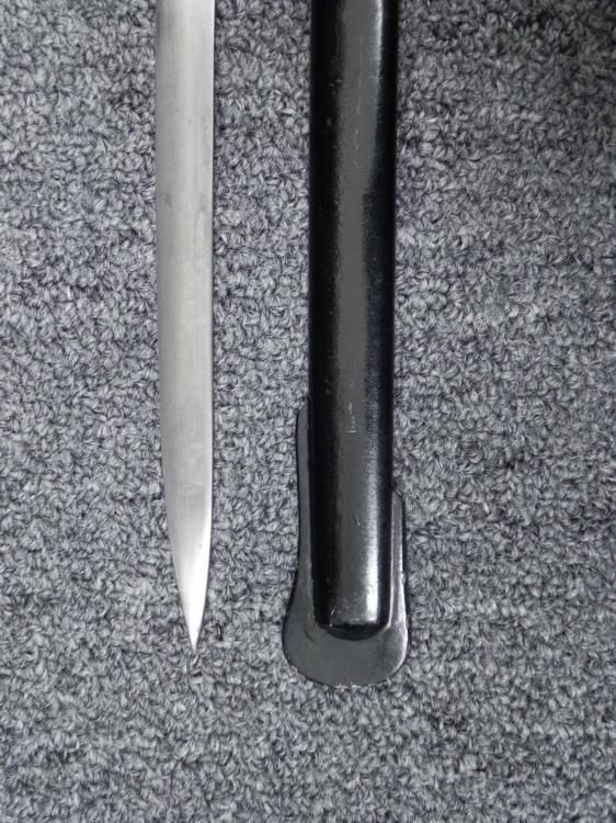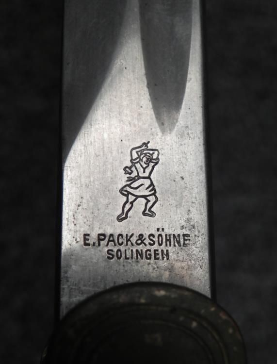 NAZI WEHRMACHT OFFICER DRESS SWORD-E PACK & SOHN 2/LOGO-EAGLE & SWASTIKA LANGET * * * GREAT LOOKING WWII BRINGBACK--NAZI ARMY OFFICER'S SABER--WIRE WRAPPED BLACK GRIP--FANCY AND HAND DETAILED OAK LEAF AND ACORN BACKSTRAP AND HANDGUARD--NICE 31 1/2" LONG BLADE--RICASSO MARKED E PACK & SOHN SOLINGEN WITH THEIR LOGO.THICK LEATHER ORIGINAL BUFFER UNDER HANDLE--FRONT LANGET HAS EAGLE AND SWASTIKA. POMMEL IS DOVES HEAD TYPE-BLACK PAINTED SCABBARD WITH HANGER RING.