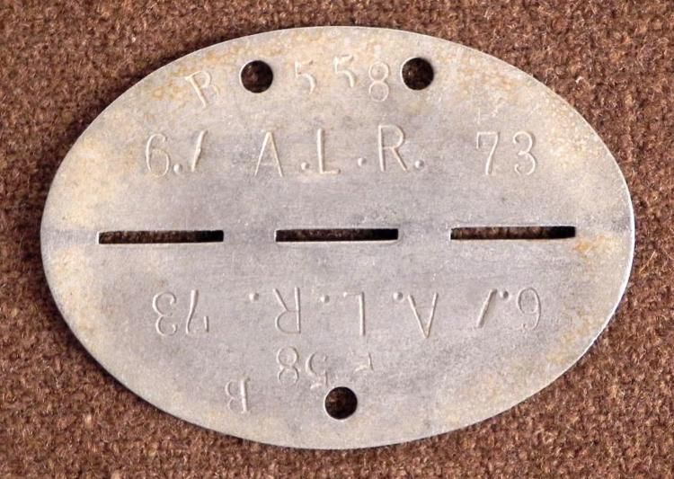 NAZI WEHRMACHT ORIGINAL DOGTAG-6TH DIVISION-73RD ALR/ARTILLERYINSTRUCTION REG.NICE ORIGINAL DOUBLE SIDED DOGTAG--A.L.R. MEANS"""ARTILLERIELEHRREGIMENT""-6TH DIVISION--73RD ARTILLERY INSTRUCTION""REGIMENT--BLOOD TYPE ""B""--SOLDIER #558"
