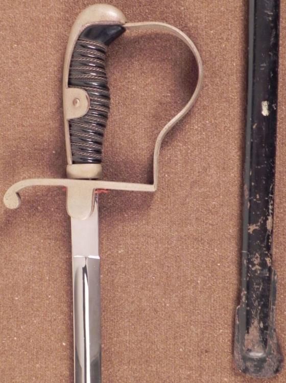 NAZI WEHRMACHT SWORD & SCABBARD BY ALCOSO & SOHN-DOVES HEAD POMMEL-ORIG * CLEAN NAZI ARMY WEHRMACHT SWORD -- WIRE WRAPPED CELLULOID GRIP-NICKEL HILT FURNITURE WITH DOVES HEAD POMMEL--BEAUTIFUL 34" BRIGHT BLADE (NO NICKS OR SHAPENING OR LIFTING)--ALCOCO & SOHN (ALEX COPPEL) MAKER MARKED ON RICASSO--BLACK SCABBARD WITH APPROX 85% ORIGINAL PAINT-NICE PATINA TO THE HILT & CROSSGUARD *