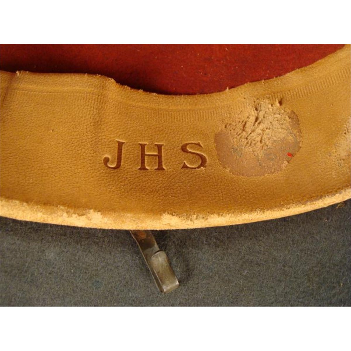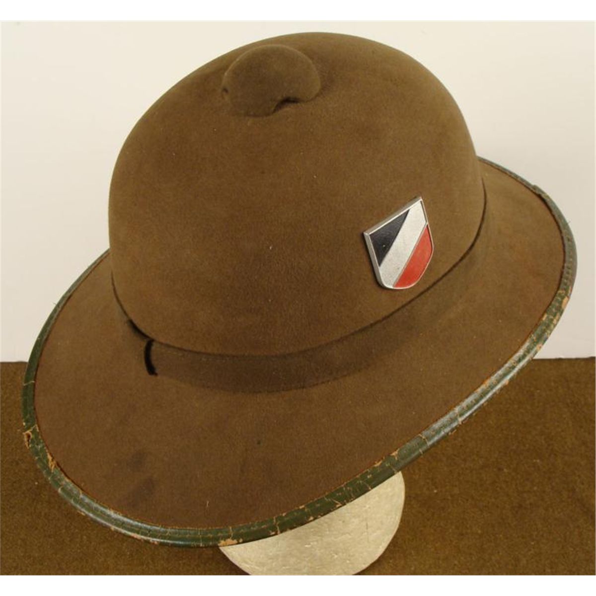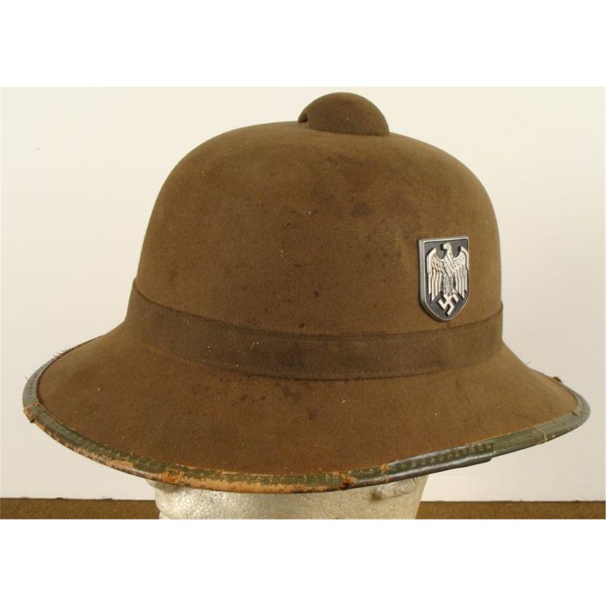 NAZI WWII AFRIKA KORPS (AK) PITH HELMET-HAS EAGLE & SWASTIKA & THREE COLORED SHIELD * GREAT BRINGBACK--INSIDE MARKED "JHS"--ON LEATHER SWEATBAND--BROWN FELT VARIETY. SOME MINOR QUALITY CONDITIONS & LIGHT STAINS-HAS EDGING & FULL SWEATBAND--NICE PIECE *