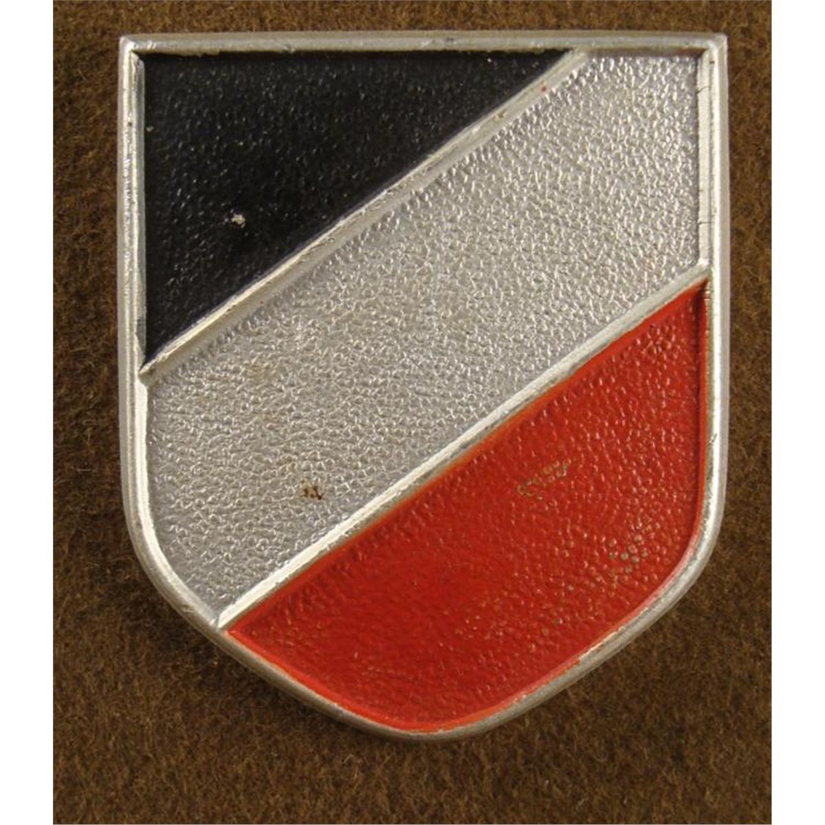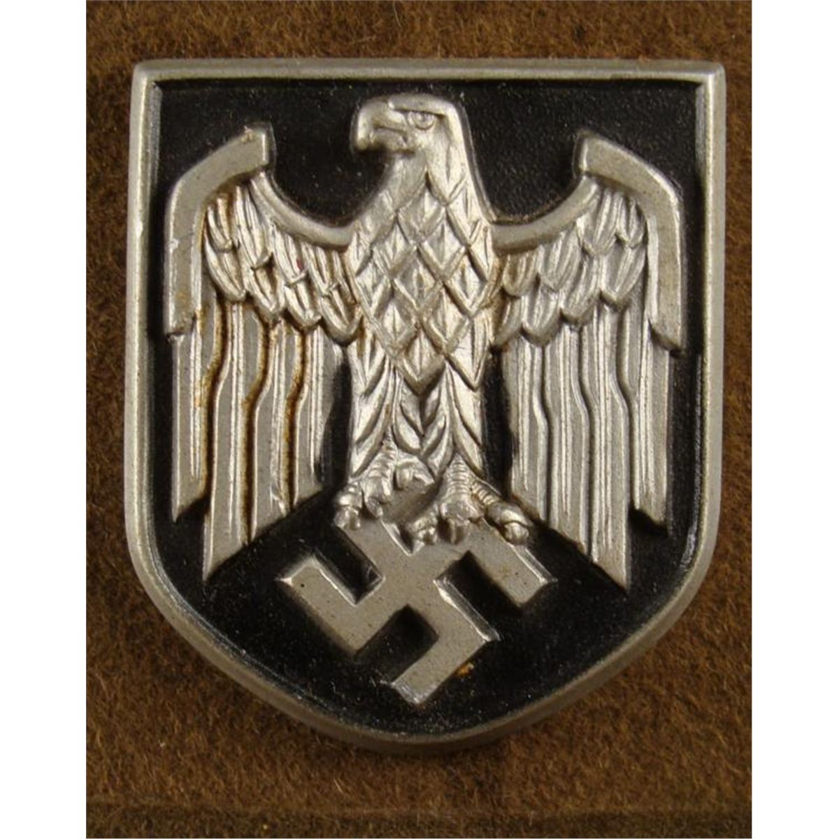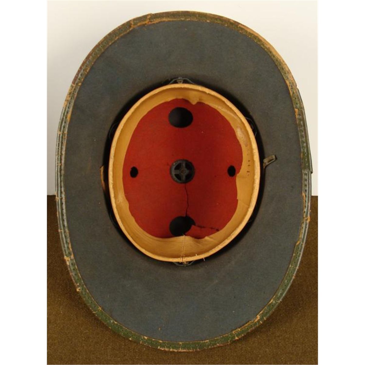 NAZI WWII AFRIKA KORPS (AK) PITH HELMET-HAS EAGLE & SWASTIKA & THREE COLORED SHIELD * GREAT BRINGBACK--INSIDE MARKED "JHS"--ON LEATHER SWEATBAND--BROWN FELT VARIETY. SOME MINOR QUALITY CONDITIONS & LIGHT STAINS-HAS EDGING & FULL SWEATBAND--NICE PIECE *