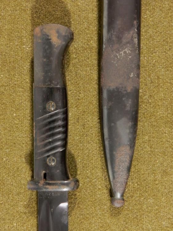 NAZI WWII K98 MAUSER COMBAT BAYONET-WITH MATCHING #'S & MAKER-DATED 1942 * NICE ORIGINAL COMBAT PIECE--90% BLUEING ON BLADE--BAKELITE GRIPS--RICASSO AND SCABBARD MARKED "42 ASW--3533"--SOME RUST BLOTCHES ON SCABBARD & POMMEL *