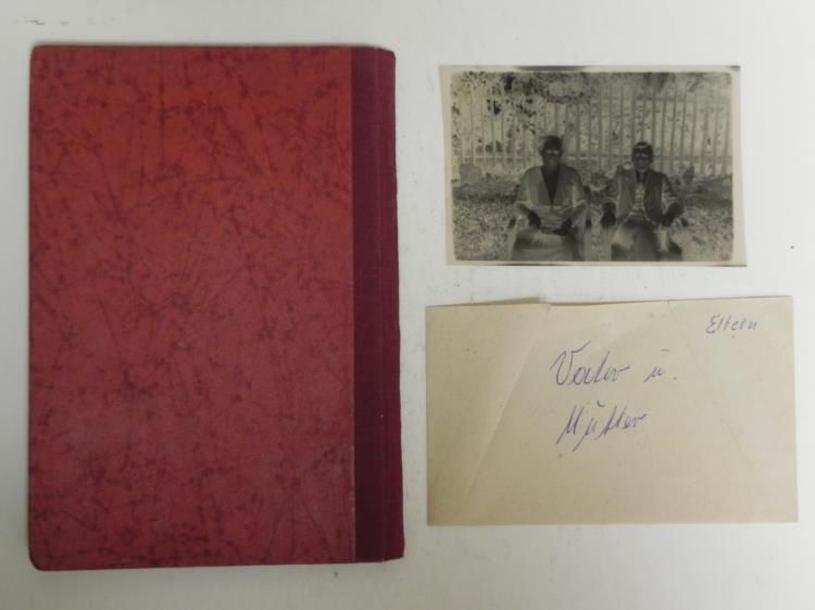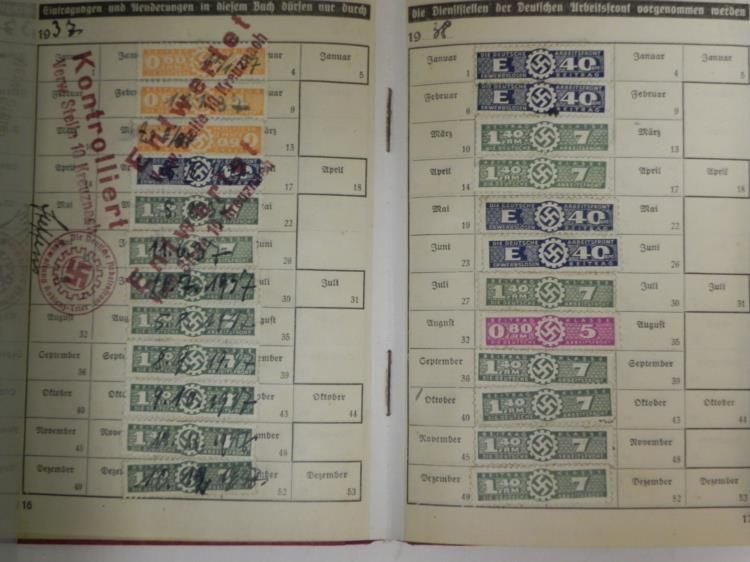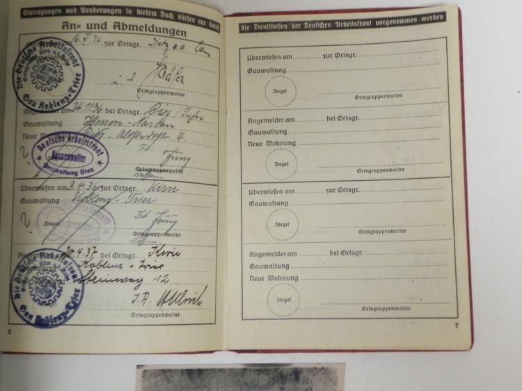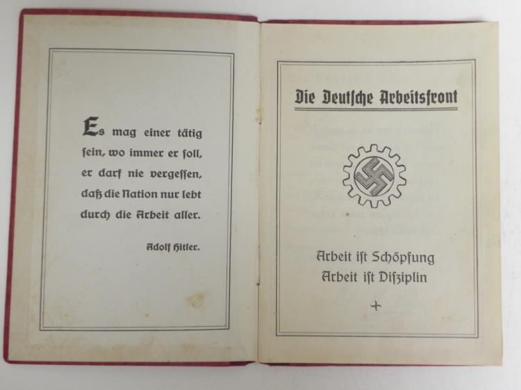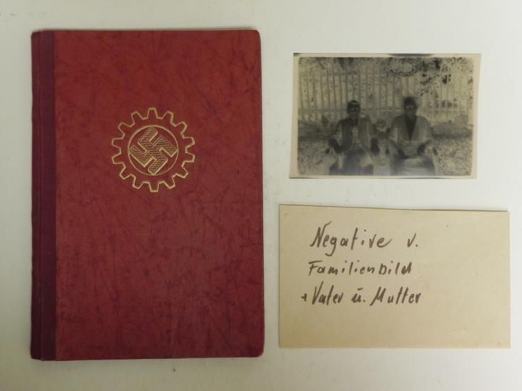THIS IS A NAZIDAF-DEUTSCHES ARBEITSFRONT ID AND DUES BOOK--ALSO PIC NEGATIVES OF FATHER & MOTHER. IT HAS REDDISH BROWN COVER WITH GOLD SWASTIKA IN GEAR WHEEL-INSIDE COVER HAS QUOTE FROM HITLER--ISSUED TO FRITZ FOHLINGER--ISSUED IN 1933 IN KOBLENZ BY DR. LEY--HAS ISSUE STAMPS--INK STAMPS WITH DETAIL--SEVERAL PAGES OF DUES STAMPS FROM THE 1930'S--ALSO HAS A SLEEVE ENVELOPE MARKED "NEGATIVE V. FAMIIILIENBILCH & VATER U MUTTER--WITH 2 PHOTO NEGATIVES.