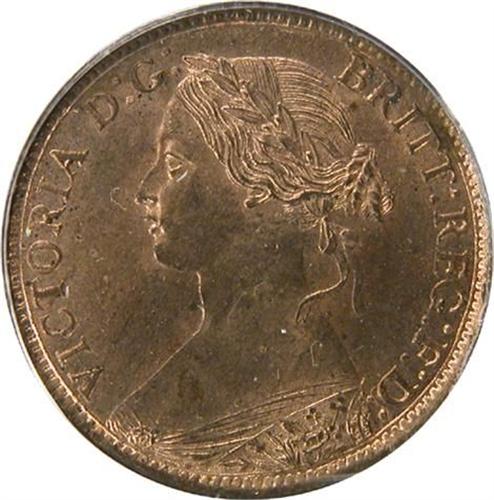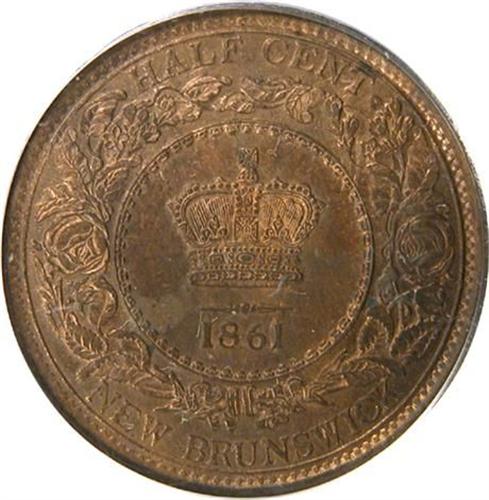 New Brunswick 1861 Half Cent PCGS MS-65 Red and Brown. This is a fully struck piece with great lustre and near flawless surfaces that are about 75% red. It is tied with two other examples as the fourth highest by PCGS, with only three MS-66 Red and Browns. No Reds are graded
