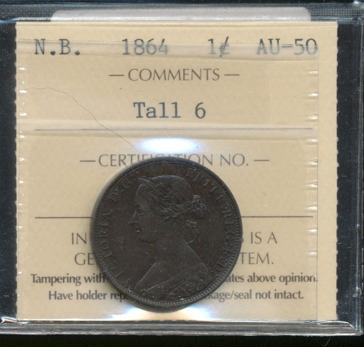 NB 1864 1¢ Tall ‘6’ ICCS AU50. The Key NB copper issue and under appreciated.