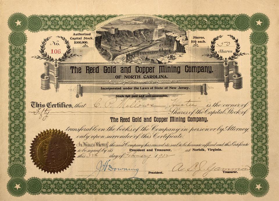 Incorporated under the laws of the State of New Jersey in 1901. No. 106, issued for 50 shares to C.P. Mellows on February 3, 1902. Signed by J.H. Downing as President and A.S.J. Gammon as Treasurer. Large vignette of 12 miners using sluice boxes and high-powered water hoses at center top. Ornate green border and black print with gilt seal at lower left. U/C. Printer: The J.C. Hall Co. Prov. R.I. & S.F. The Reed Mine was the site of the first gold discovery in the U. S. in 1799, and for that it assumes a significance proportionally larger than the value of nuggets and ore found near Little Meadow Creek and the adjoining hills [http://www.rocksandminerals.com/reedmine.htm]. In fact, the Reed Mine began the country's gold mining industry. Conrad Reed, son of John Reed, originally found a 17 lb. "rock" near Little Meadow Creek, and originally thought worthless, but by 1806 mining operations had become sophisticated enough that miners were using mercury to separate the finer particles of gold from the sand. By the 1820s, enough gold was produced in NC that the community began requesting a U. S. government mint be opened in Charlotte to produce coinage. Following John Reed's death in 1845 the property changed hands several times, but ultimately ran into a basic economic problem: low-grade ore compared with what was being found in the west, along with the high cost of producing the gold and water shortages. After a nugget weighing nearly 23 pounds troy and measuring 10 inches in length and 4 inches in diameter was found in 1896, heavy machinery including a ten-stamp mill, crusher, and steam pump were brought in. By 1903, the Reed Mine was closed, but was reopen briefly in 1911-12 for the placers and old dumps to be worked. It was noted in Stevens' 1903 Copper Handbook that a letter from the Reed Gold and Copper Mining Company was "returned unclaimed" [Ref: rocksandminerals.com/reedmine].