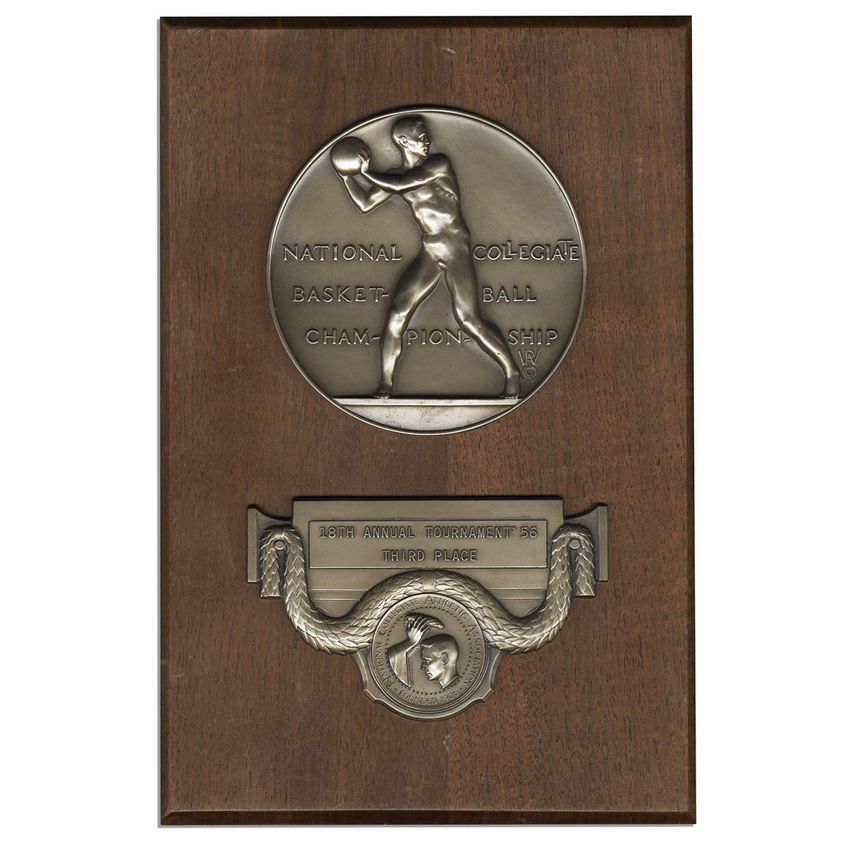 Award plaque from the 1956 NCAA Final Four Championship. Plaque style award for went to the Temple squad and was likely bestowed upon a player. Plaque features a mounted medal with a basketball player carved in relief, and below it a plaque reading, ''18th Annual Tournament '56 / Third Place''. Measures 9'' x 13''. Near fine.