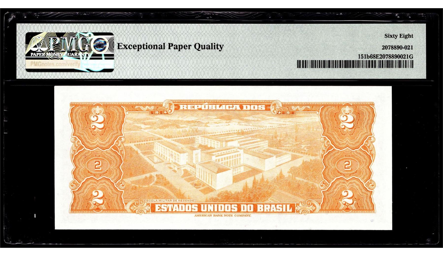 One ND (1954-58) Brazil 2 Curzerios Tesouro Nacional Note PMG Superb Gem Uncirculated 68EPQ. PMG Certified.