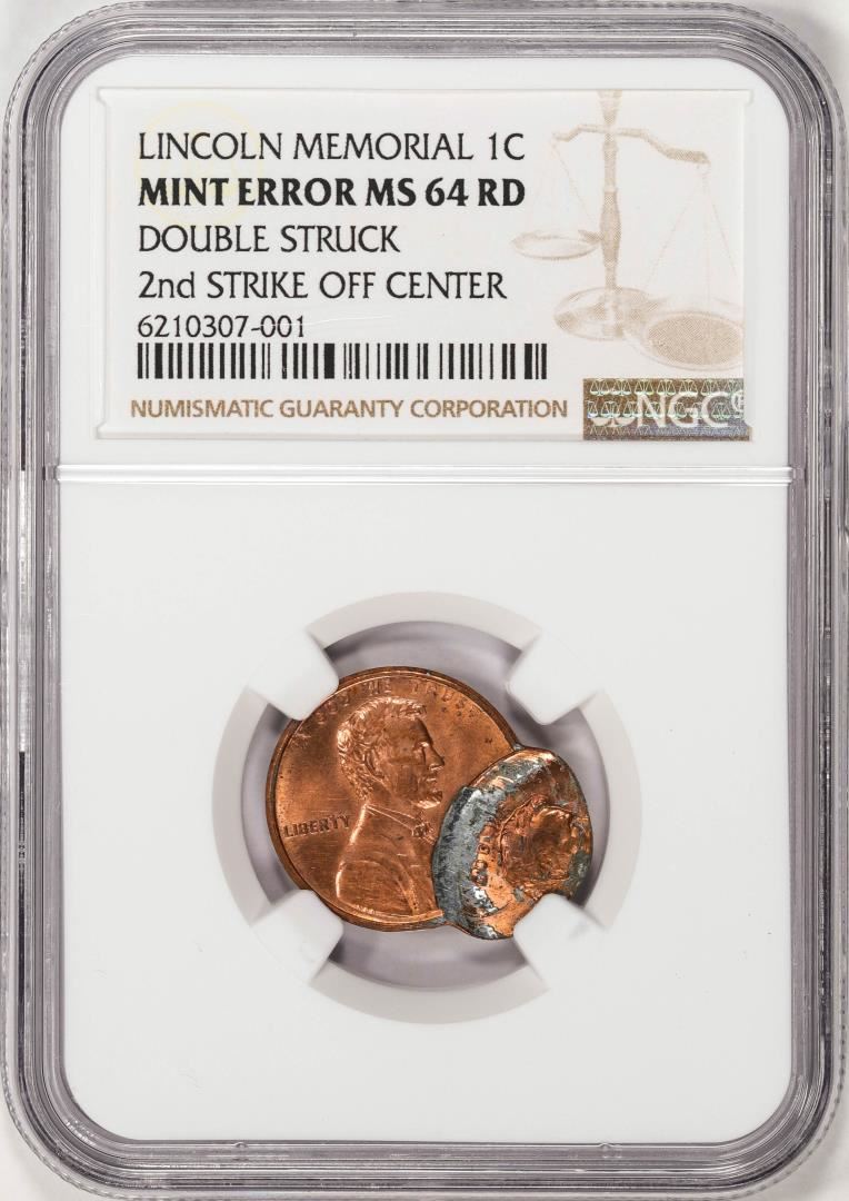 One ND Lincoln Cent Coin Double Struck 2nd Strike Off Center NGC Mint Error MS64RD. NGC Certified.