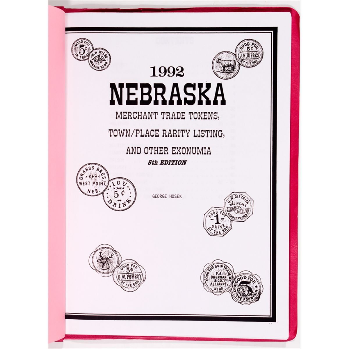 Hosek, George. 1992 Nebraska Merchant Trade Tokens, Town/Place Rarity Listing and Other Exonumia. Includes "New Towns/Places, New Good For Mirrors, Town Rarity Listings. Index is broken into type of business using tokens in Nebraska. The content is broken into a grid format showing total counts per business and per town place. Fifth Ed., 1992. 49pp. Bound in a red folder cover. 9" x 11.5". - Vinegar Collection