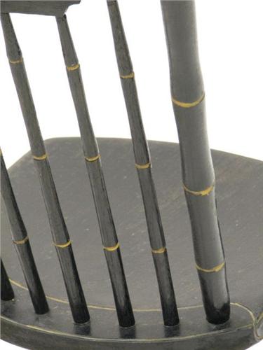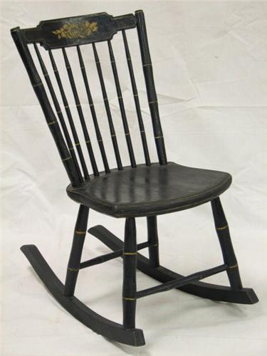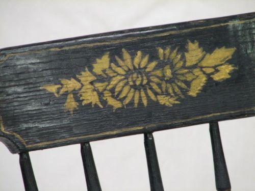 Circa late 18th century. New England Windsor Fan-Back Step-down Rocker. Features 7 turned cylindrical spindles and bamboo turned splayed legs fitted into shaped saddle seat, well shaped seat with incised edging, gold floral stencil design on crest, old black finish. Condition: minor imperfections. Dimensions: Chair Height 30.5", Seat Height 15", seat width 16.5".