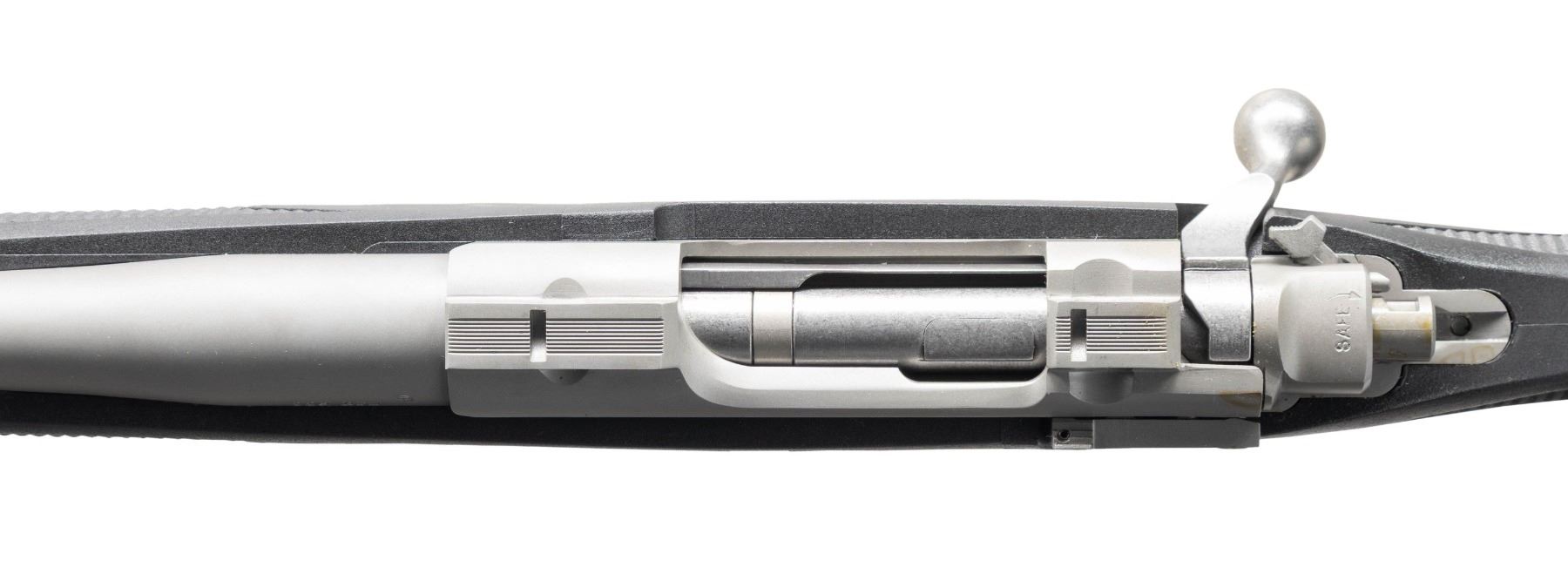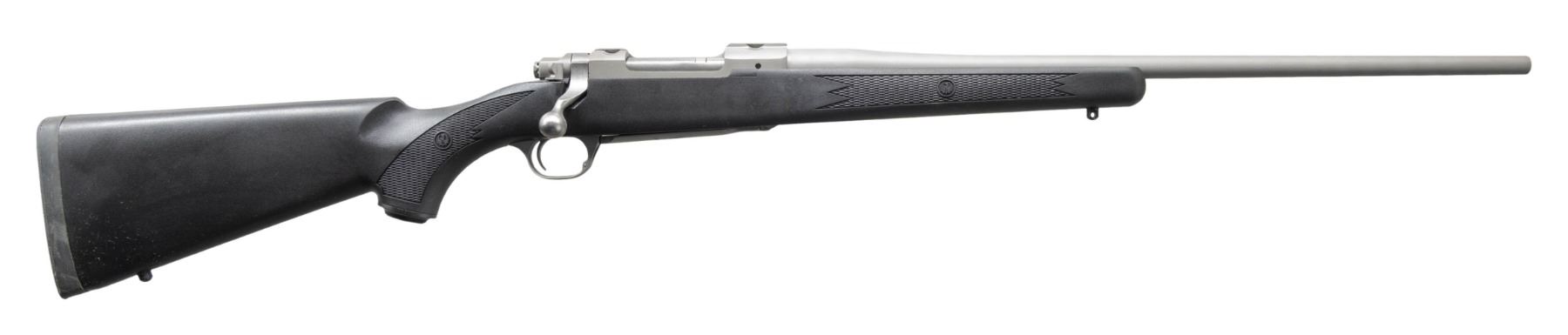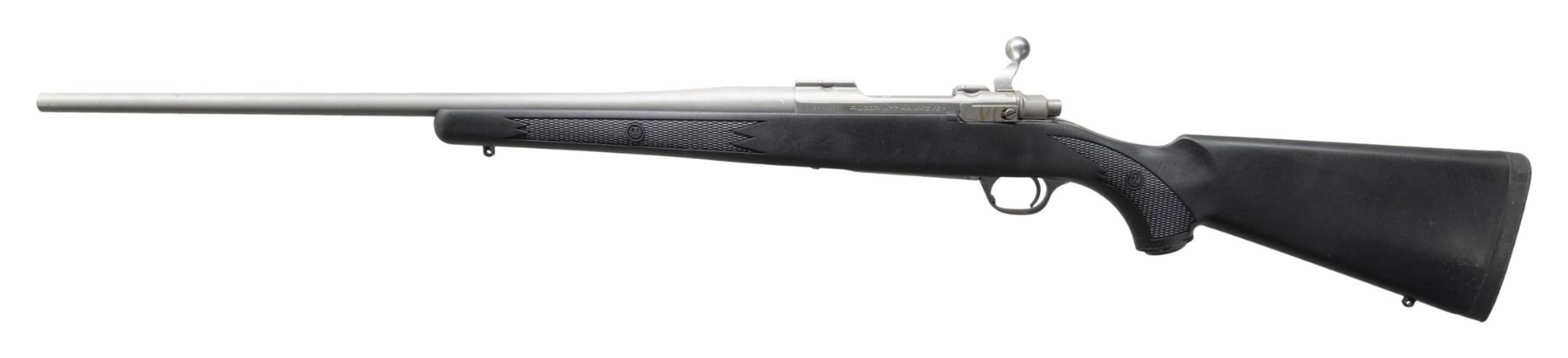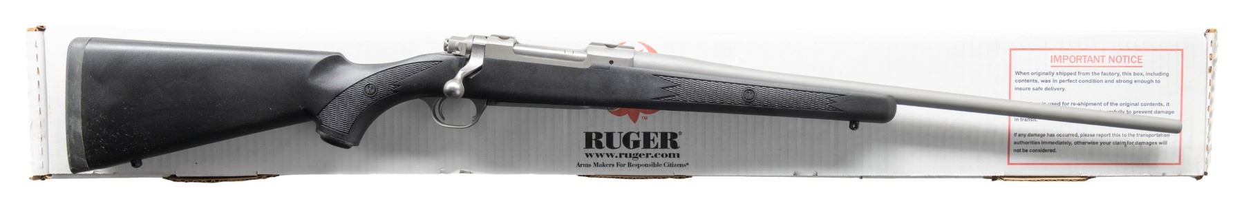 STAINLESS ACTION RIFLE WITH MATCHING FACTORY BOX. Cal. 223 Rem. S# 712-00030. Shipped 2014 as Catalog # HKM77RFP; Model 07115. Bbl. 22". Matte stainless steel finish. Control feed action w/ claw extractor, integral ring grooves & matching numbered bolt. Floorplate has laser engraved Ruger emblem. Checkered black synthetic stock w/ sling studs, Ruger grip cap & red pad. UNATTACHED ACCESSORIES: matching numbered box containing lock, Ruger rings & paperwork. CONDITION: all aspects near excellent. (24-3336/MD). MODERN. $400-600.