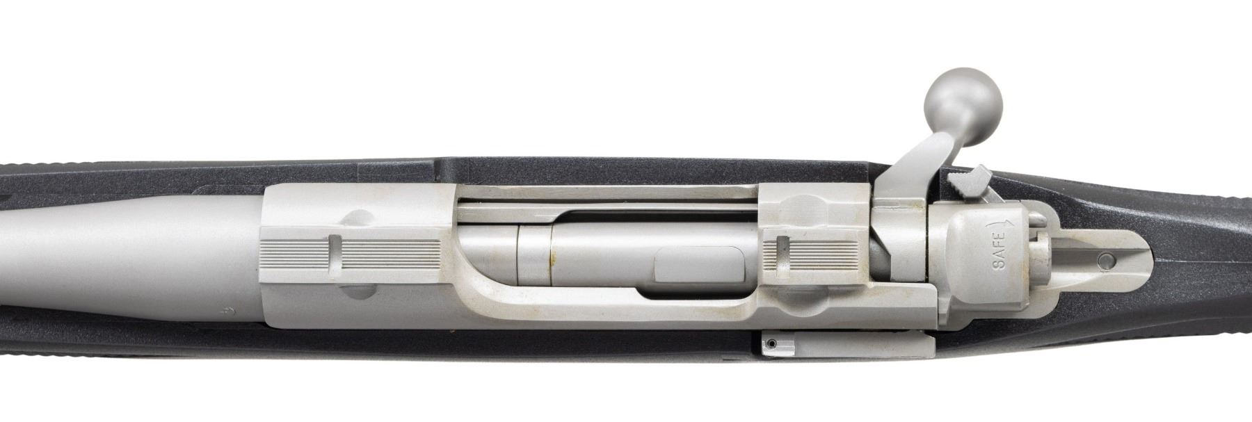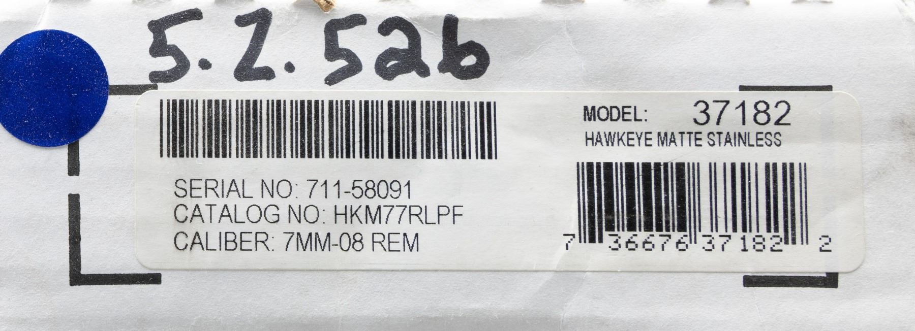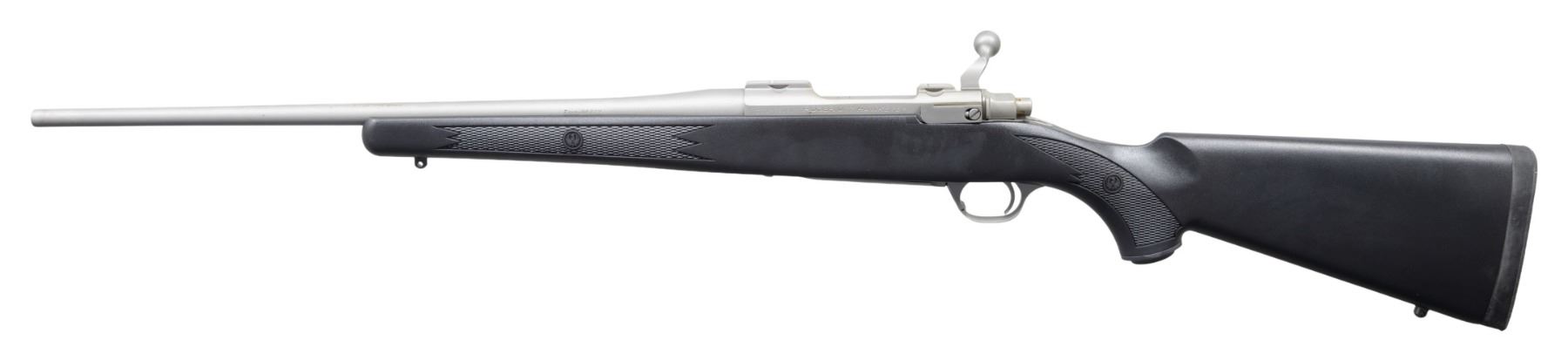 WEATHER ULTRA-LIGHT BOLT ACTION RIFLE WITH MATCHING FACTORY BOX. Cal. 7mm-08 Rem. S# 711-58091. Shipped 2012 as Catalog # HKM77RLFP; Model 37182. Bbl. 20". Matte stainless finish. Control feed action w/ claw extractor, integral ring grooves & matching numbered bolt. Floorplate has laser engraved Ruger emblem. Checkered black synthetic stock w/ sling studs, Ruger grip cap & red pad. UNATTACHED ACCESSORIES: matching numbered box containing lock, Ruger rings & paperwork. CONDITION: all aspects near excellent. (24-3564/MD). MODERN. $400-600.