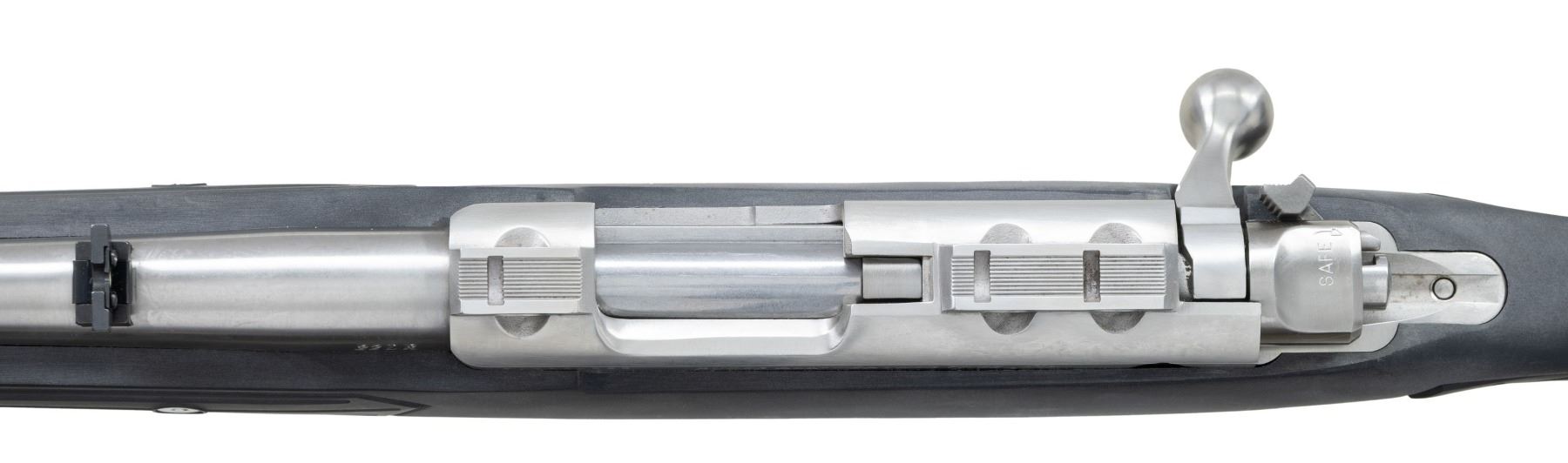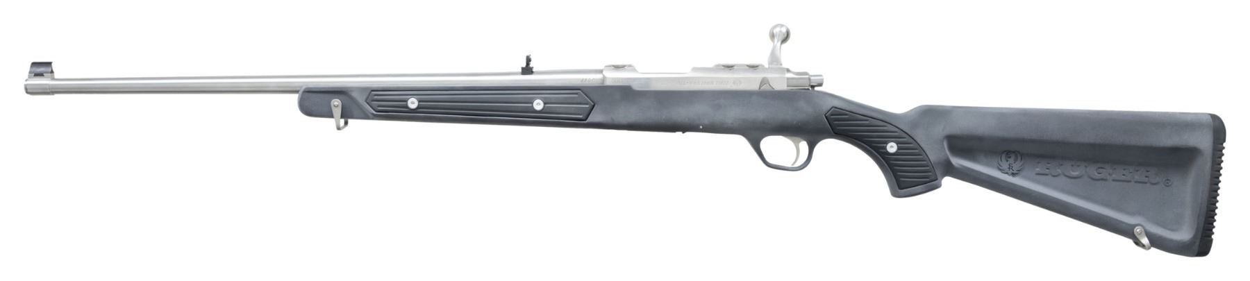 STAINLESS BOLT ACTION RIFLE WITH MATCHING FACTORY BOX. Cal. 22 LR. S# 703-56968. Shipped 2009 as Catalog # K77/22-RSP; Model 07008. Stainless finished receiver & 22" bbl. Gold bead band mounted front sight & folding leaf adj. rear sight. Action has integral ring grooves & matching numbered bolt. Matte black DuPont Zytel "Boat-Paddle" stock w/ grip panels, black pad & stainless swivels. MAGS: 1 BX-1, 10 rd. mag. UNATTACHED ACCESSORIES: matching factory box with Ruger paperwork, lock & rings. CONDITION: all aspects near excellent; stock has age white storage residue. (24-3629/MD). MODERN. $500-750.