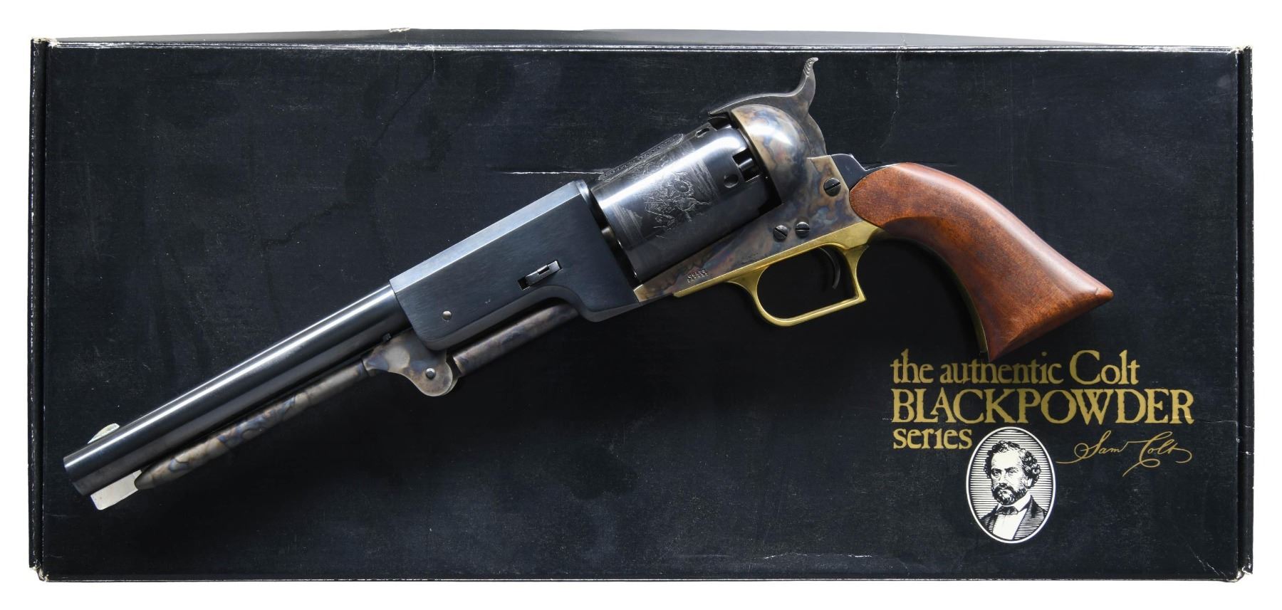 ACTION PERCUSSION REVOLVER WITH FACTORY BOX. Cal. 44. S# 4160. Bbl. 9". Black Powder Series Walker single action percussion revolver mfg. by Colt. Top flat of the breech is marked "ADDRESS. SAML COLT NEW-YORK CITY", with "US/ 1847" marked on the right above the wedge. Left side of frame is marked "COLTS/ PATENT". Cyl. is roll marked with Colt's Texas Ranger scene. Frame, hammer, and loading lever exhibit a case color hardened finish, with the bbl., bbl. wedge, cyl., trigger, and backstrap exhibiting a blue finish. Brass trigger guard, with 1-piece smooth wood grip. Silver blade front sight, with V-notch rear sight on hammer. Trigger guard retains its factory quality control inspection tag. UNATTACHED ACCESSORIES: matching factory box. CONDITION: near new, with metal components retaining virtually all of their original factory finishes overall. Mirror bore, retaining well defined rifling throughout. Grip is excellent. Box shows some exterior wear, but otherwise remains sturdy and serviceable. PROVENANCE: Estate of Russell Dickerman. (01-27136/MLW). ANTIQUE. $500-800.