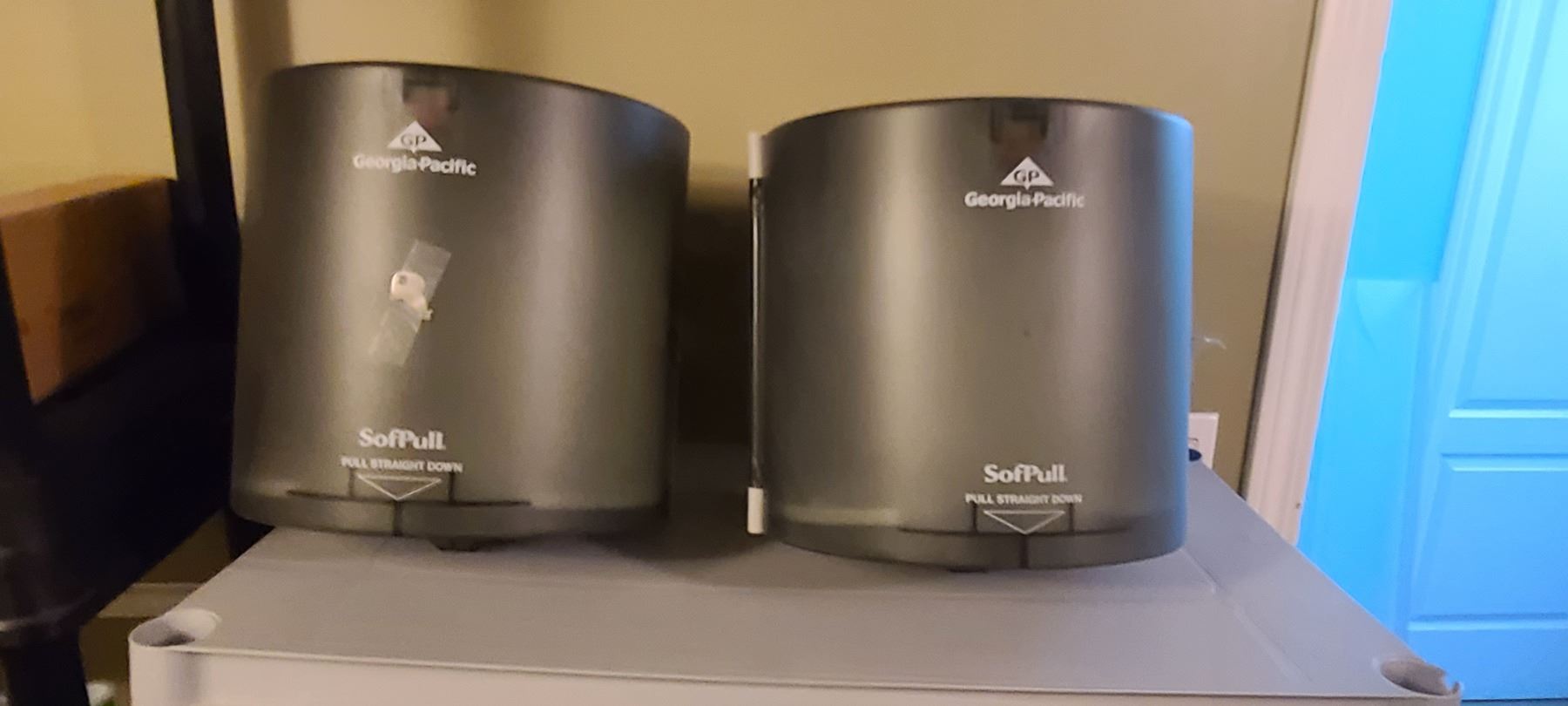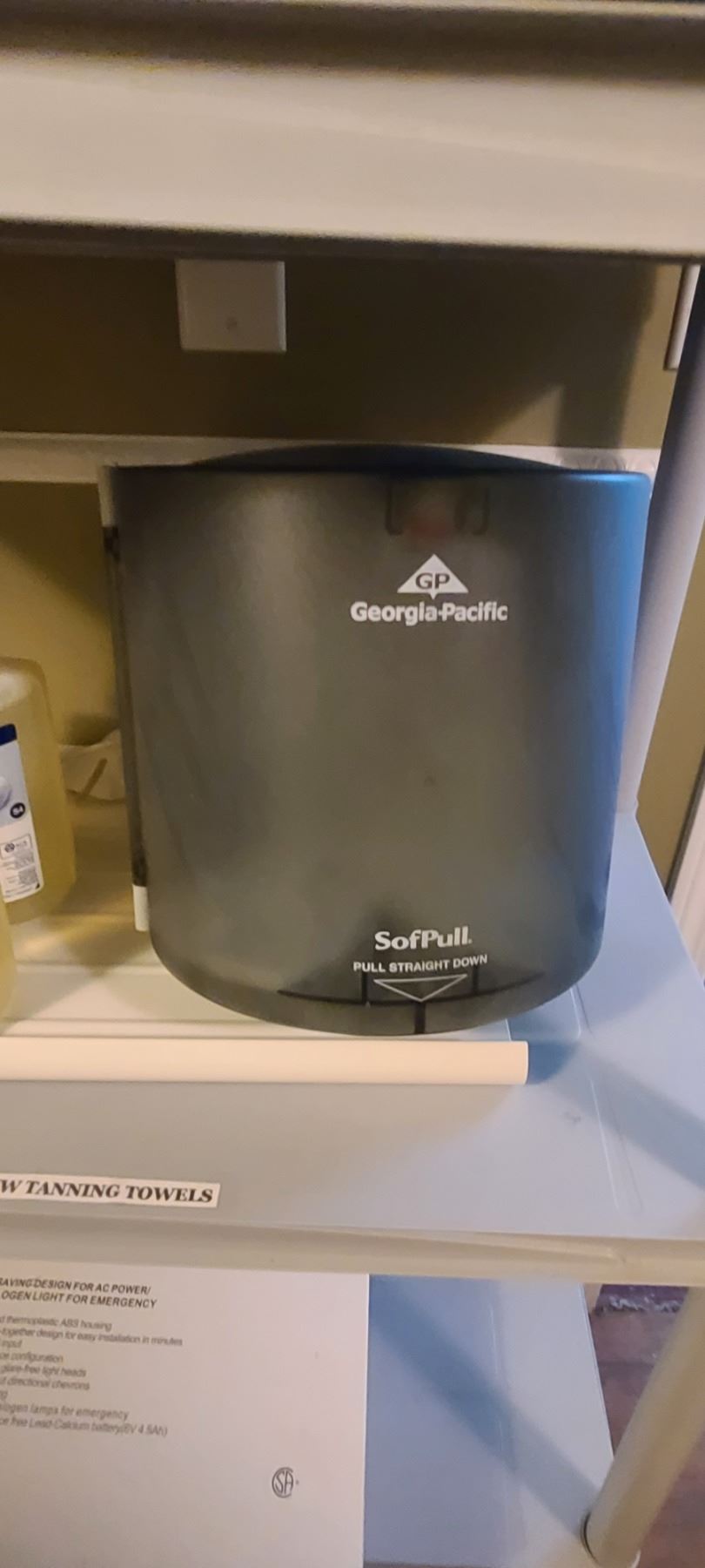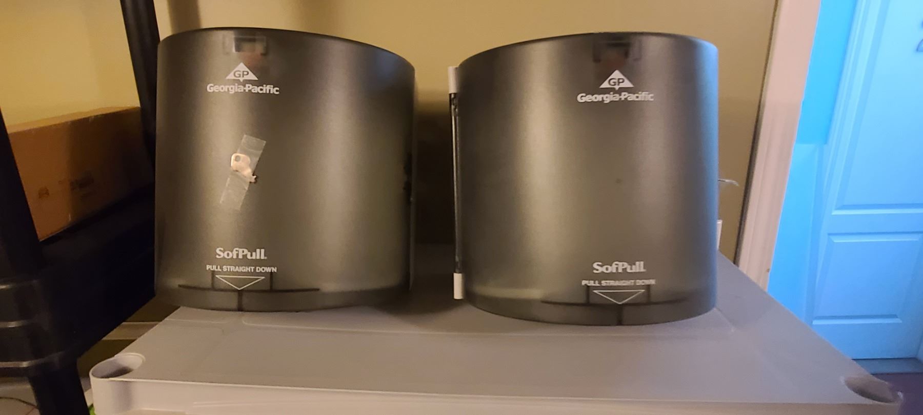 NEAR NEW GEORGIA PACIFIC SOF PULL PAPER TOWEL DISPENSER AND FOUR BOTTLES OF HAND SOAP FOR TORK DISPENSERS
