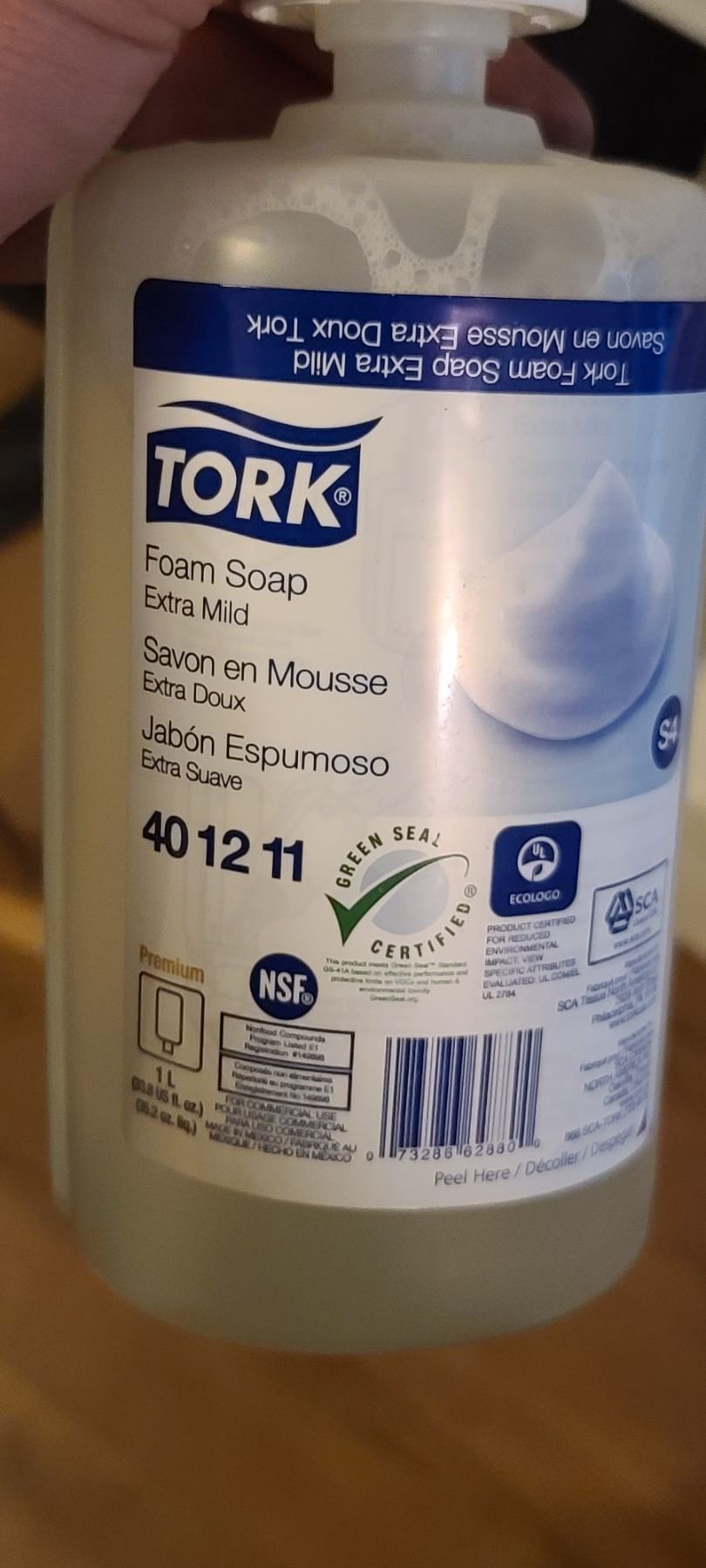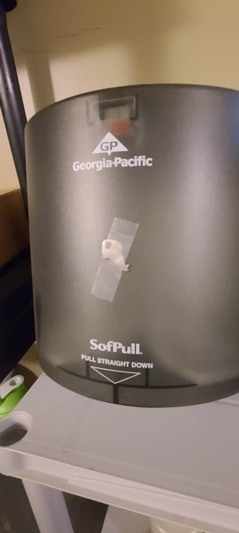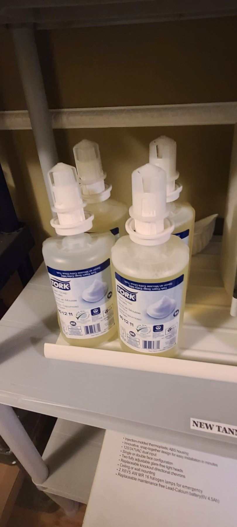 NEAR NEW GEORGIA PACIFIC SOF PULL PAPER TOWEL DISPENSER AND FOUR BOTTLES OF HAND SOAP FOR TORK DISPENSERS