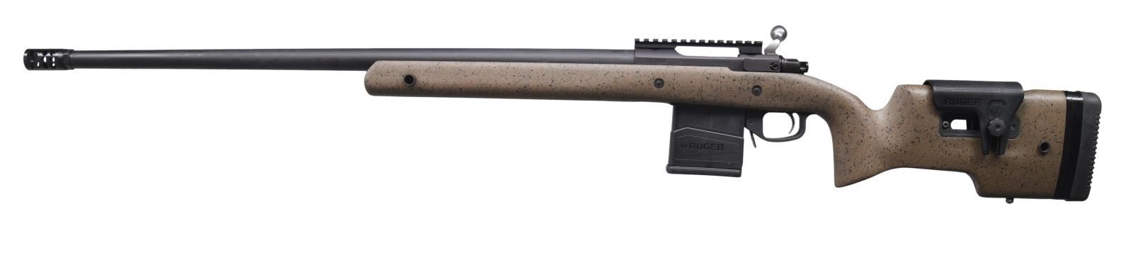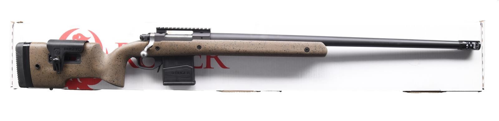 MATCHING FACTORY BOX. Cal. 6.5 Creedmoor. S# 712-50105. Bbl. 26". M77 Hawkeye bolt action rifle mfg. by Ruger in 2019. Top of the bbl. is marked with Ruger's mfg. information, with the cal. designation marked on the left at the breech. Left side of the receiver is marked with the S#, followed by "RUGER M77 HAWKEYE". Metal components exhibit a matte black finish. Laminated brown pistol grip buttstock with black speckling features a 2-way adj. comb and a M-LOK rail mounted on the underside of the forearm. Threaded bbl. is fitted with a Ruger Hybrid muzzle brake. MAGS: 1 10-rd. UNATTACHED ACCESSORIES: matching factory box. CONDITION: near new, with metal components retaining virtually all of their original factory finishes overall. Mirror bore, exhibiting grease and well-defined rifling throughout. Stock is excellent. Box shows some mild exterior wear and some light tearing, but otherwise remains sturdy and serviceable. (24-6789/MLW). MODERN. $400-600.