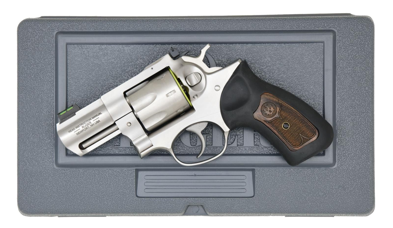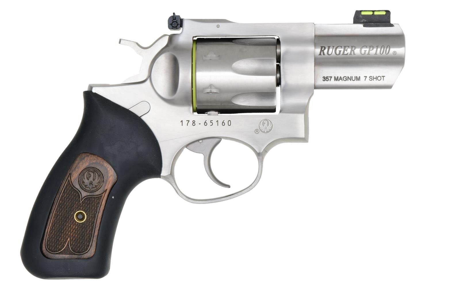 WITH SHIPPING BOX & MATCHING FACTORY CASE. Cal. 357 Mag. S# 178-65160. Bbl. 2 5/8". Model GP100 double-action revolver mfg. by Ruger in 2017. Left side of the bbl. is marked with Ruger's mfg. information, with "RUGER GP100" above the cal. designation on the right. Right side of the frame is marked with the S# and Ruger logo. Metal components exhibit a stainless steel finish overall. Frame is mounted with a 1-piece black rubber grip that features checkered wood Ruger logo panels on either side. Green fiber optic front sight with adj. square notch rear sight. UNATTACHED ACCESSORIES: shipping box containing matching factory hard case. CONDITION: near new, with metal components retaining virtually all of their original factory finishes overall. Mirror bore, exhibiting well-defined rifling throughout. Grip is excellent. Shipping box shows some light exterior wear but otherwise remains sturdy and serviceable. (23-6171/MLW). MODERN. $500-700.