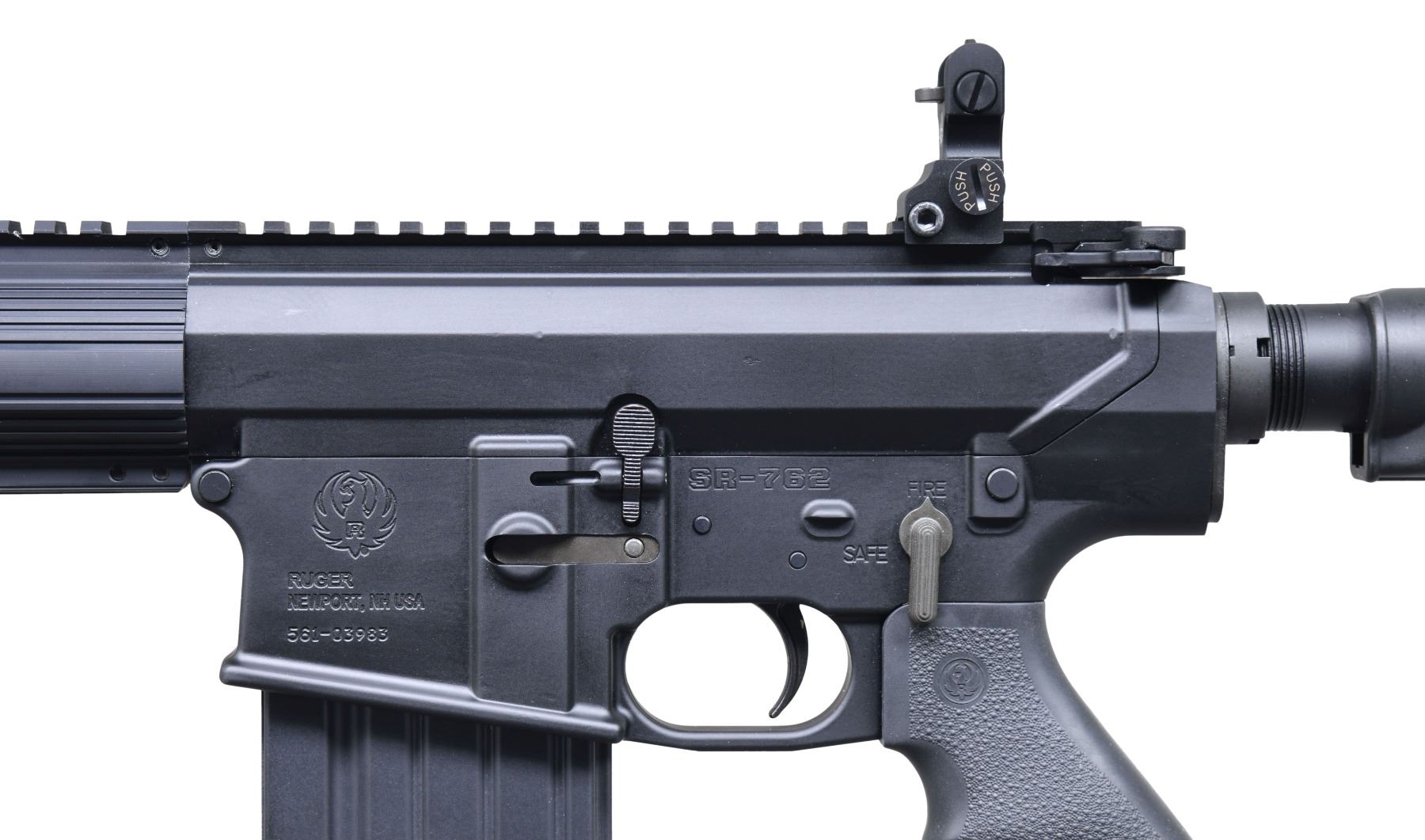 SHIPPING BOX, SOFT CASE, & MATCHING FACTORY BOX. Cal. 308 Win. S# 561-03983. Bbl. 16 1/2". SR-762 semi-automatic rifle mfg. by Ruger in 2013. Left side of the receiver is marked with the Ruger logo above Ruger's mfg. information and the S#, with "SR-762" marked towards the safety lever. Metal components exhibit a black anodized finish overall, save for on the bbl. and gas block, which exhibit a parkerized finish. Black polymer collapsible buttstock, with textured Ruger logo black rubber pistol grip. Ruger flip-up post front sight and rear sights. Grooved handguard is drilled and tapped for rail segments and/or rail covers. Bird cage flash hider. MAGS: 3 DPMS 20-rd. mags. UNATTACHED ACCESSORIES: shipping box, matching factory box, black factory soft case containing factory paperwork, mags., as well as factory rails / rail covers. CONDITION: near new, with metal components retaining virtually all of their original factory finishes overall. Mirror bore, exhibiting scattered spots of grease, while retaining well defined rifling throughout. Black polymer and rubber furniture are excellent overall. Box and shipping box are excellent overall. (23-6861/MLW). MODERN. $1,000-1,500.