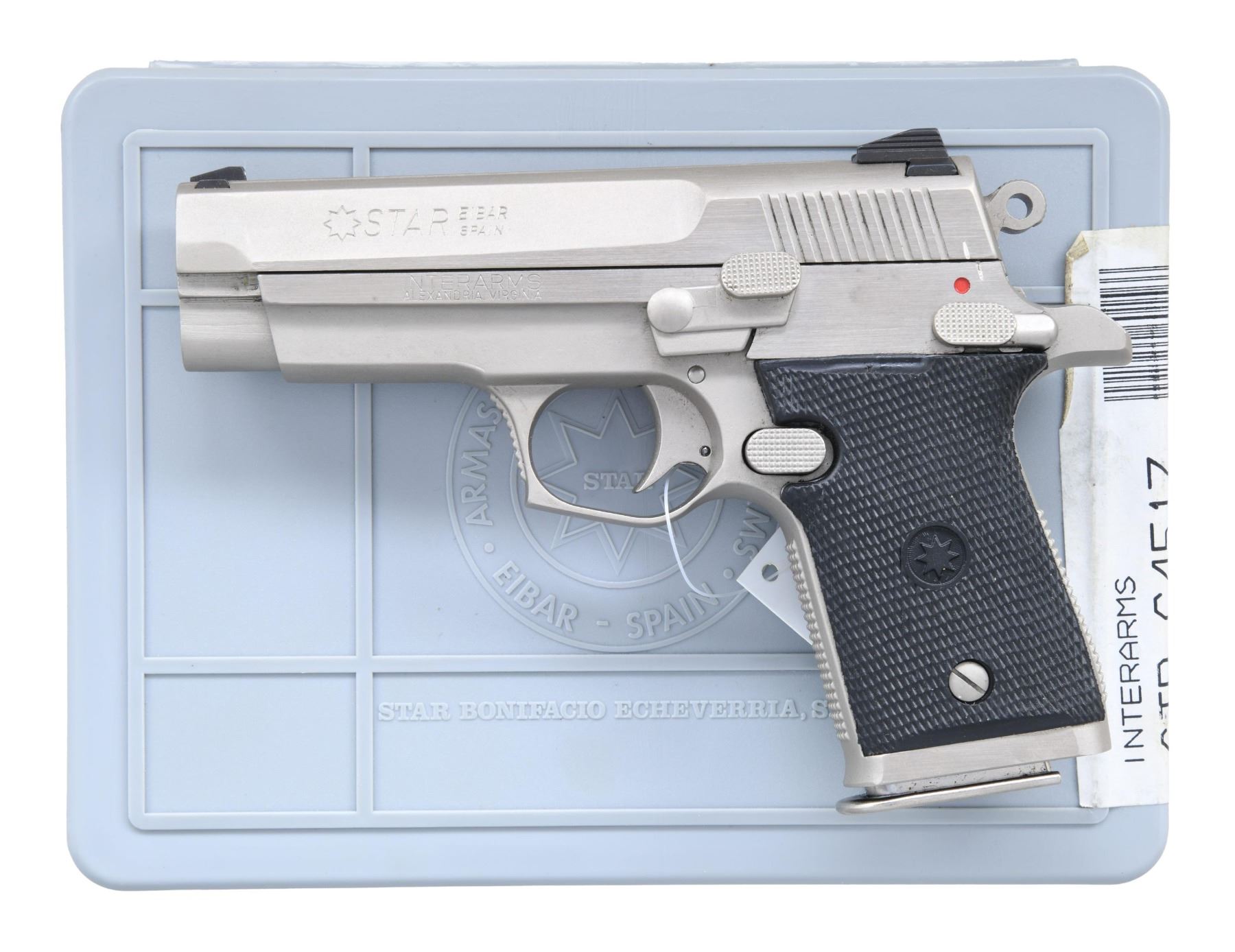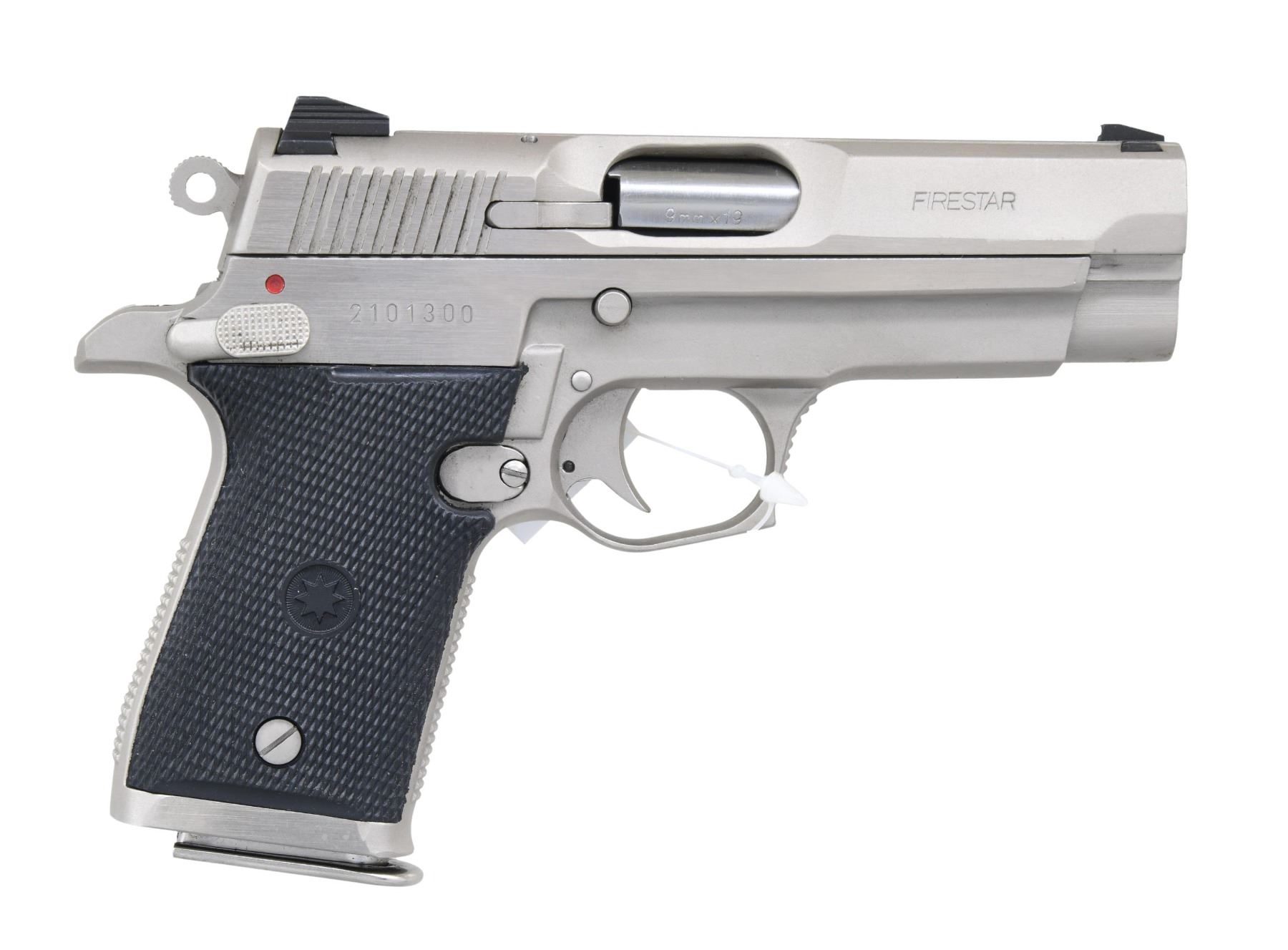 SEMI-AUTOMATIC PISTOL WITH MATCHING HARD CASE. Cal. 9x19mm. S# 2101300. Bbl. 3 3/8". M42 "Firestar" semi-automatic pistol mfg. in Spain by Star and imported by Interarms. The left side of the slide is marked with the Star logo, followed by "STAR" and "EIBAR/ SPAIN", with "FIRESTAR" marked on the right. Left side of the frame is marked with Interarms' importer information, with the S# marked on the right. Metal components exhibit a 2-tone stainless steel finish, save for on the bbl. which is blued and features a chamber that is polished in-the-white. Frame is mounted with 2-piece Star logo checkered black rubber grips. Standard white dot front sight, with 2-dot square notch rear sight. 1 7-rd. UNATTACHED ACCESSORIES: factory hard case, with matching Interarms' end label. Hard case contains factory paperwork, a cleaning rod, and a disassembly tool. CONDITION: excellent, with metal components retaining bountiful amounts of their original factory finishes overall. Brilliant mirror bore, retaining sharp and well defined rifling throughout. Grips are excellent. Hard case is very good overall. A fine example of a Star M43 "Firestar" semi-automatic pistol. PROVENANCE: The Estate Collection of Charles Wagner. (25-312/MLW). MODERN. $300-500.