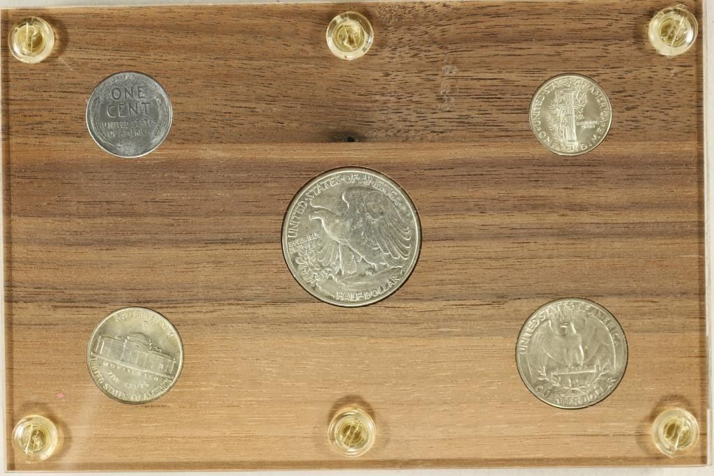 1943-P CENT, 1943-P 35% SILVER JEFFERSON WAR NICKEL, 1943-D MERCURY DIME, 1943-D WASHINGTON QUARTER AND 1943-P WALKING LIBERTY HALF DOLLAR, ALL UNC