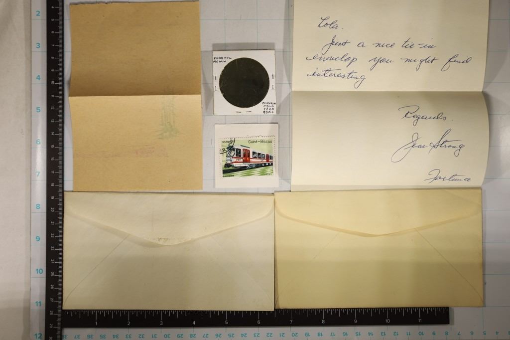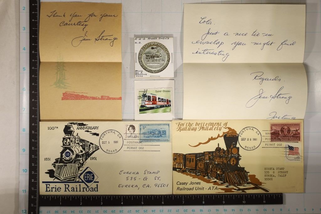ERIE RAILROAD 100TH ANNIVERSARY WITH 3 CENT 125 YEARS OF RAIL TRANSPORTATION AND 15 CENT DOLLEY MADISON CANCELLED STAMPS WITH SHORT HAND WRITTEN LETTER ON TRAIN STATIONARY, 2ND ENVELOPE "CASEY JONES RAILROAD UNIT-ATA" FOR