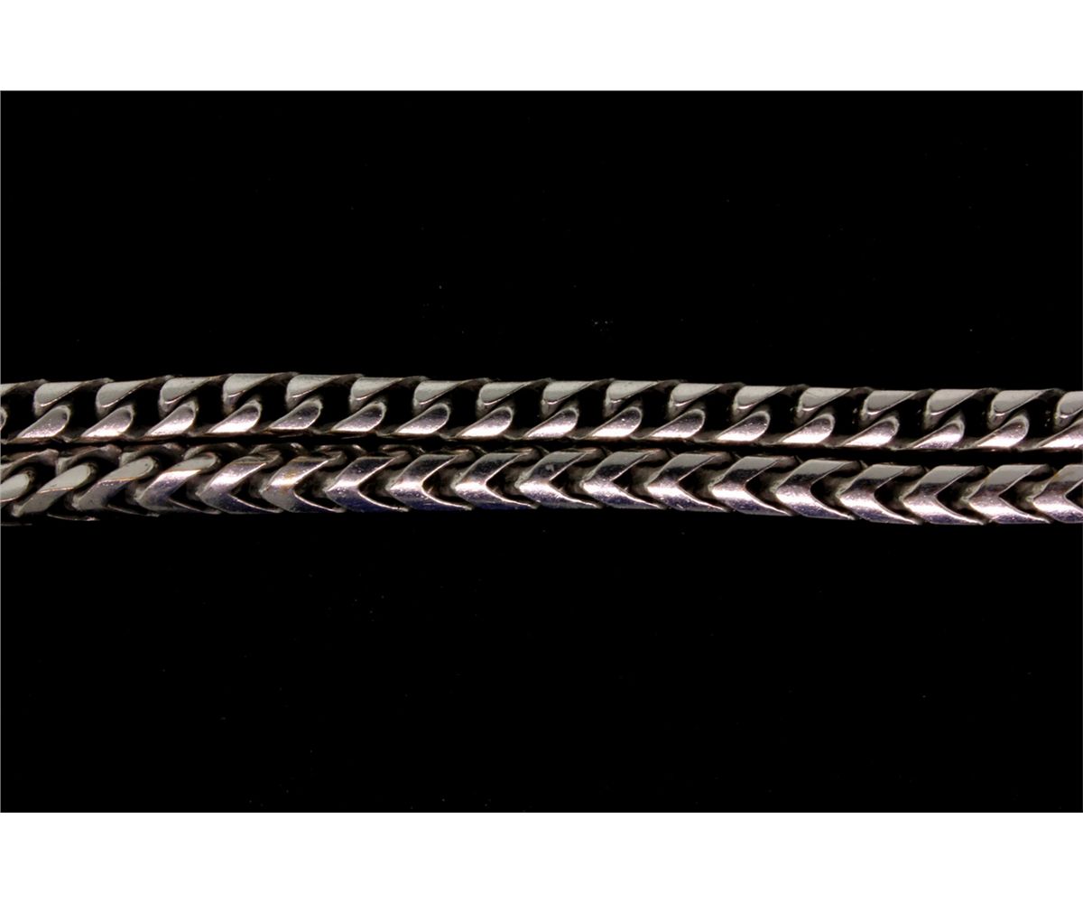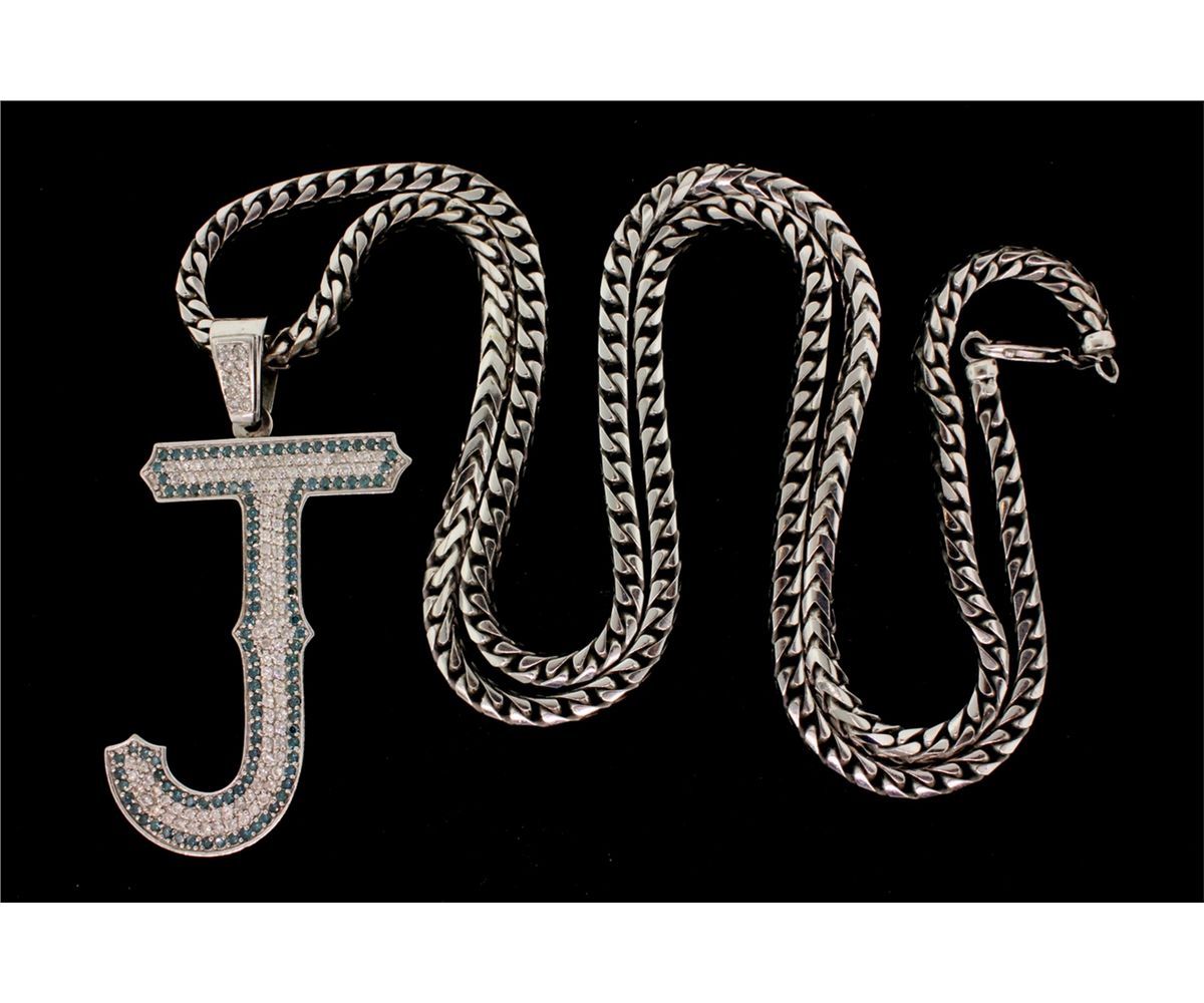 NECKLACE: [1] 10 karat white gold square Cuban chain, 5.2mms, 40"s; and a 10 karat white gold "J" pendant set with 224 round diamonds, approx 6.0 carats total weight, H-J and irradiated blue in color and SI2-I2 in clarity; 191.3 grams total weight.