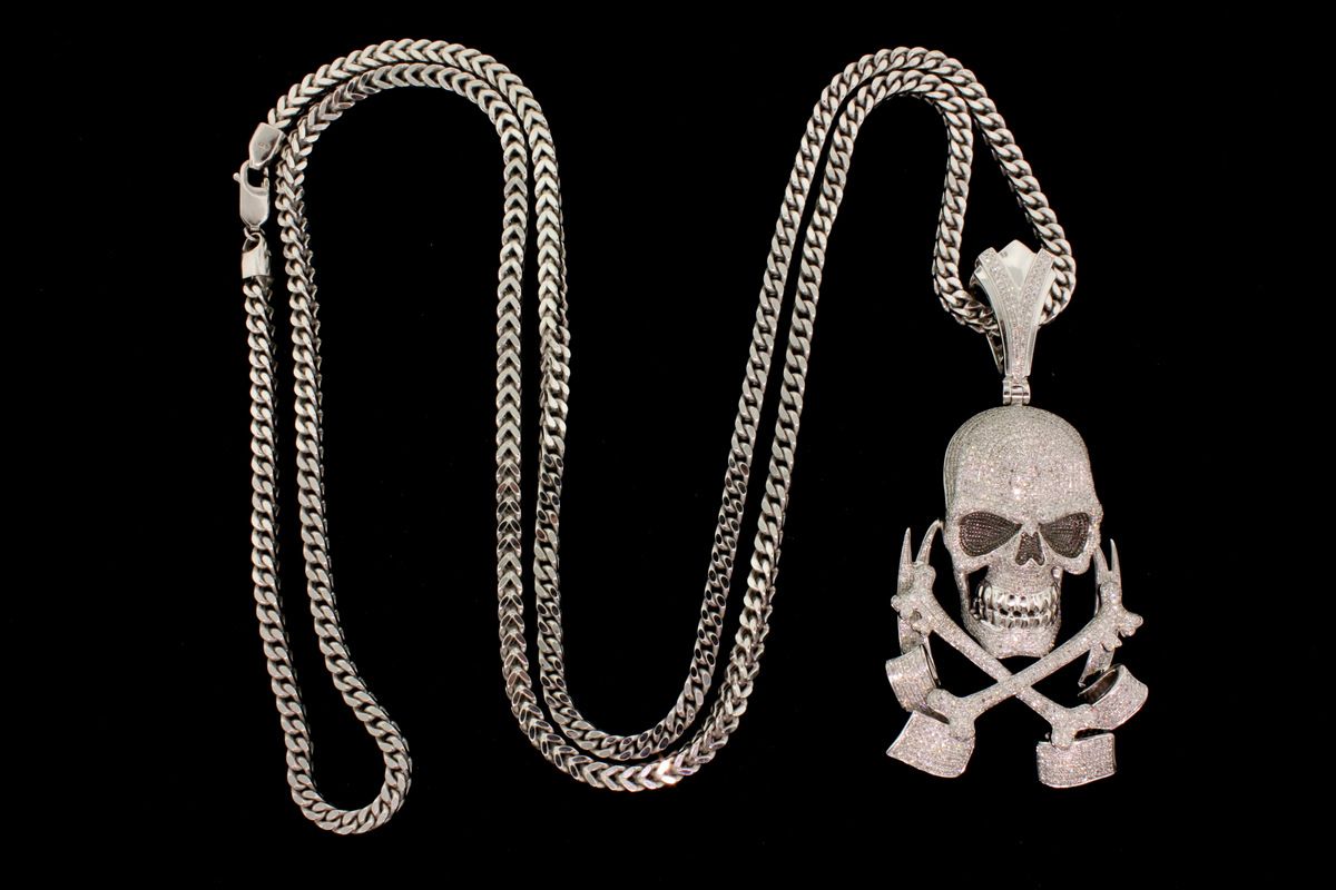 NECKLACE: [1] 10KWG Franco chain, 4.0mms in diameter, 40 ''s, 45.0 grams; and [1] 14KWG skull and crossbones pendant pave; set with single cut diamonds, approx. 3.50 cttw., good/ H-I/ VS2-SI1, 44.6 grams