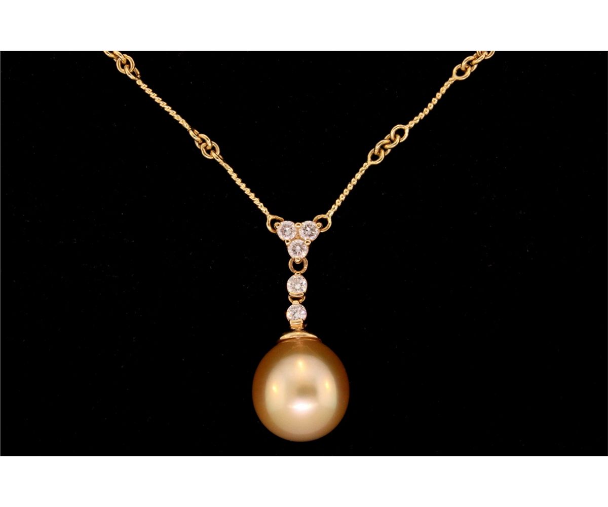 NECKLACE: [1] 14KYG fancy link chain Na Hoku necklace with an attached pendant set with 5 rd diamonds, approx. 0.25 cttw., good / G/H / SI1-SI2; and an 11.62mm Golden South Sea pearl; 16"s; 5.9 grams