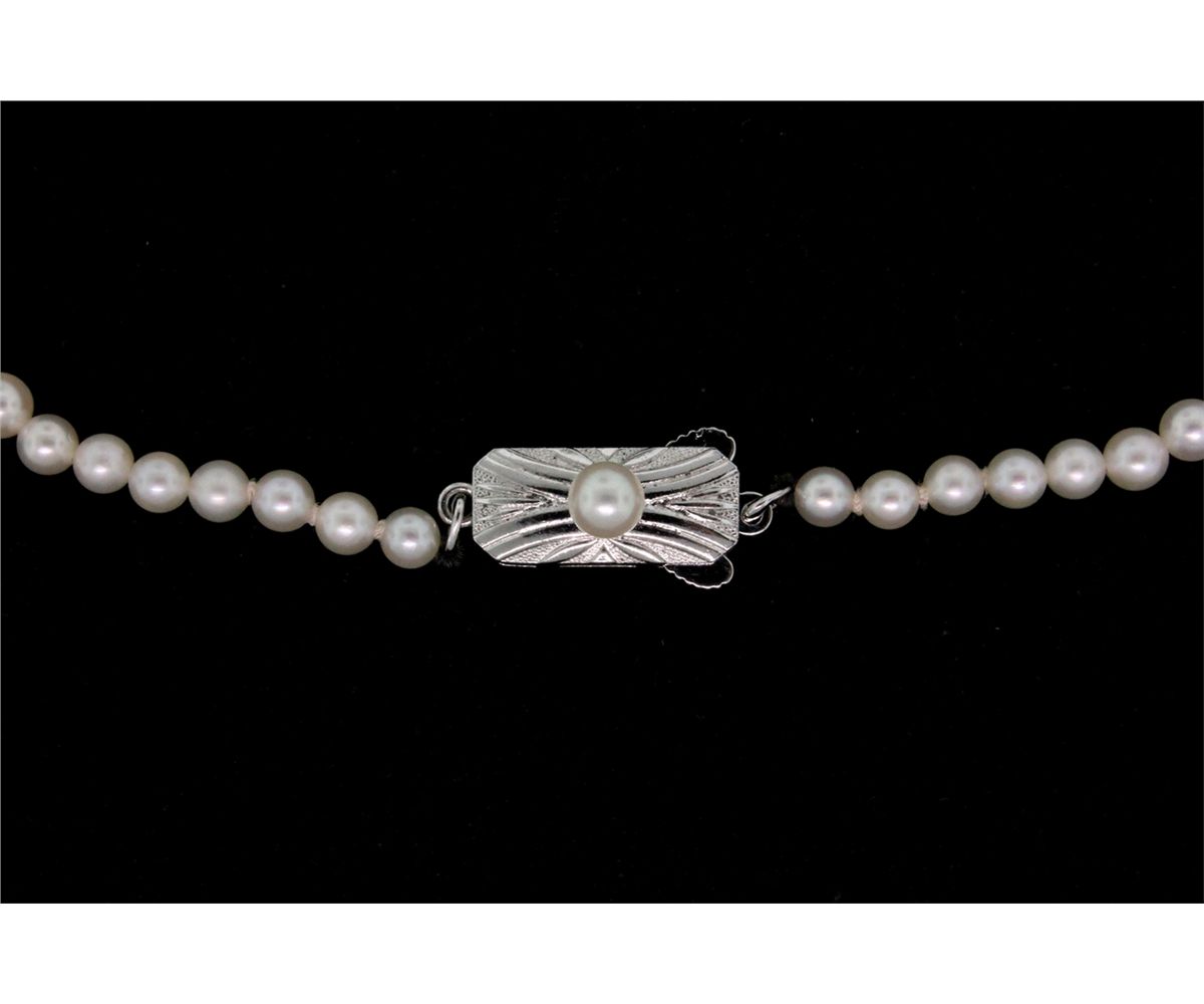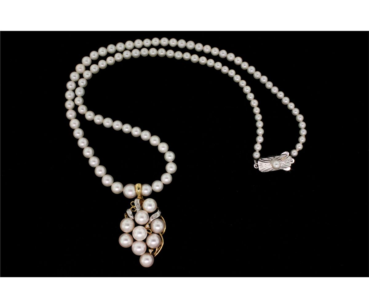 NECKLACE: (1) 18" long strand of Mikimoto Akoya cultured pearls graduating from 7.0mm to 3.5mm. AA quality. Mikimoto trademark stamped on clasp. Clasp is sterling with 4.5mm pearl in center. Enhancer is 1.5" x 1" wide set with (8) rsc diamonds of I1 clarity and H color. approx. 0.08cttw.