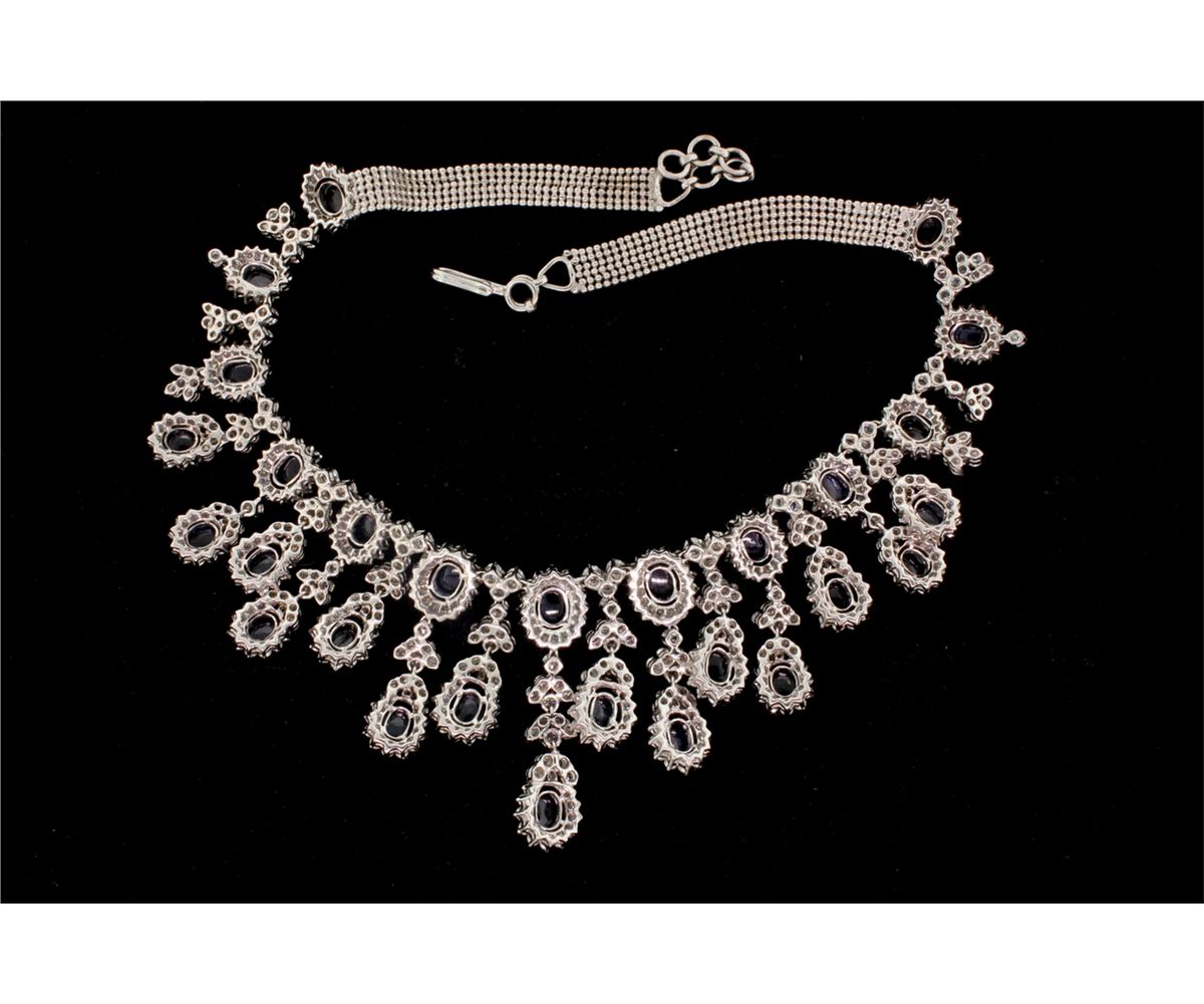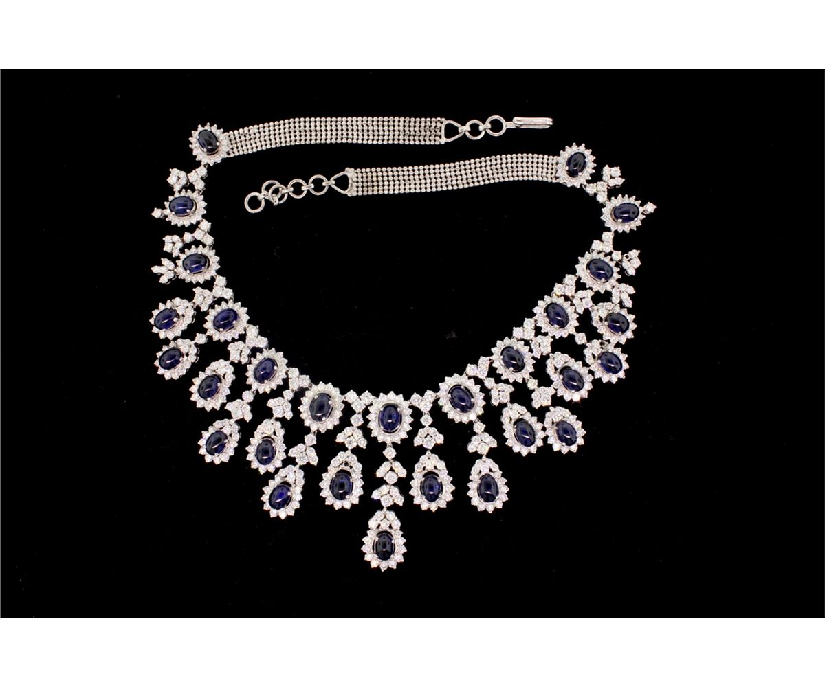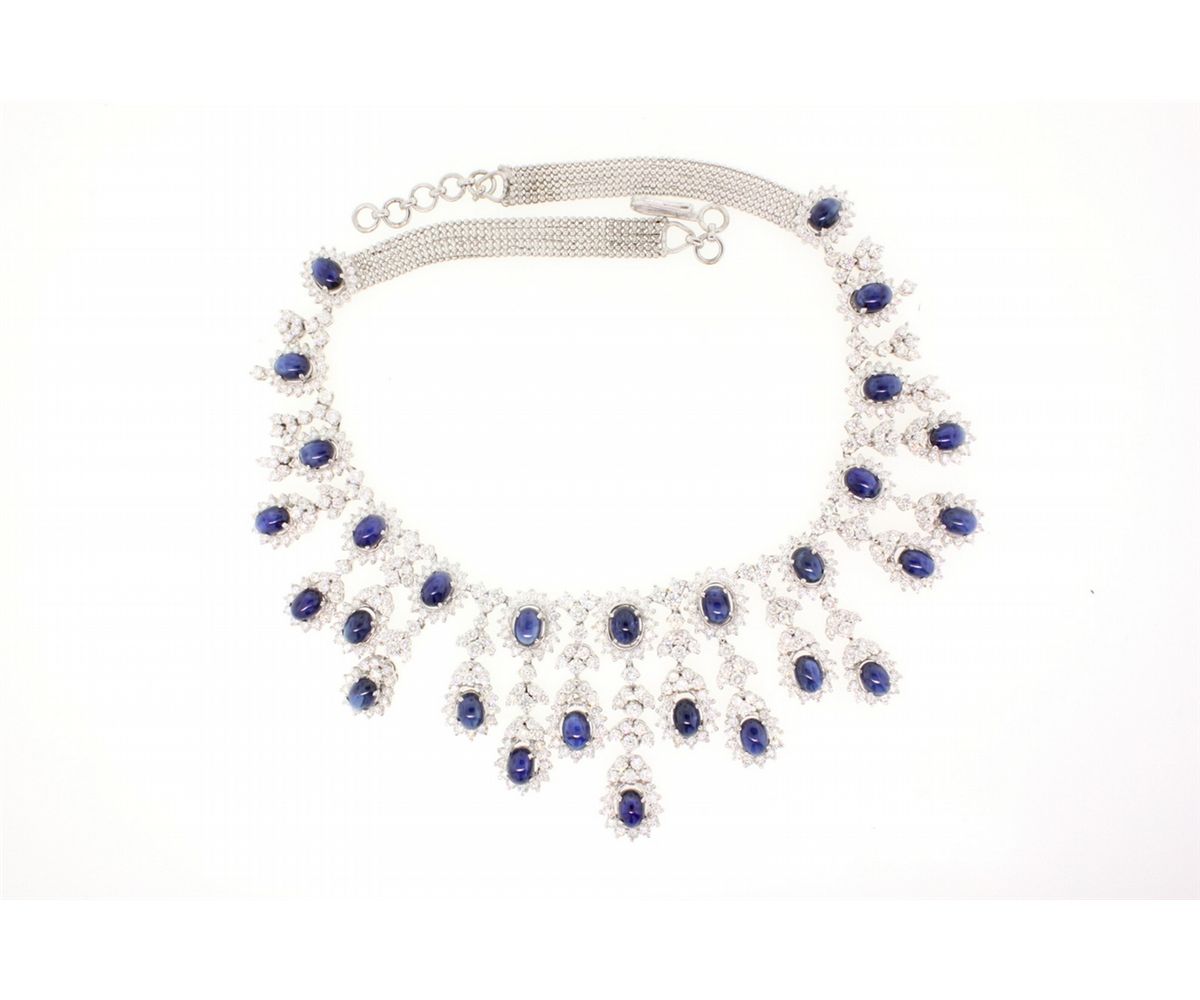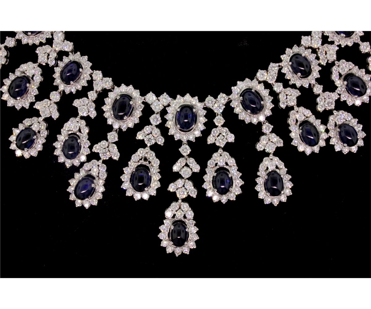 NECKLACE: [1] 18kwg sapphire and dia fringe style necklace. Set with (28) 7.00mm x 5.00mm oval sapphire cabochons, medium blue, good quality; approx. 14.00cttw and (318) rbc dias VS-2 - SI1 H-I color, approx. 16.00cttw. 17" long. 94.2gtw. One missing stone.