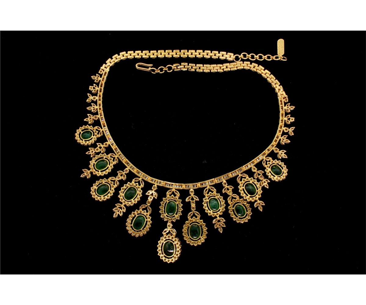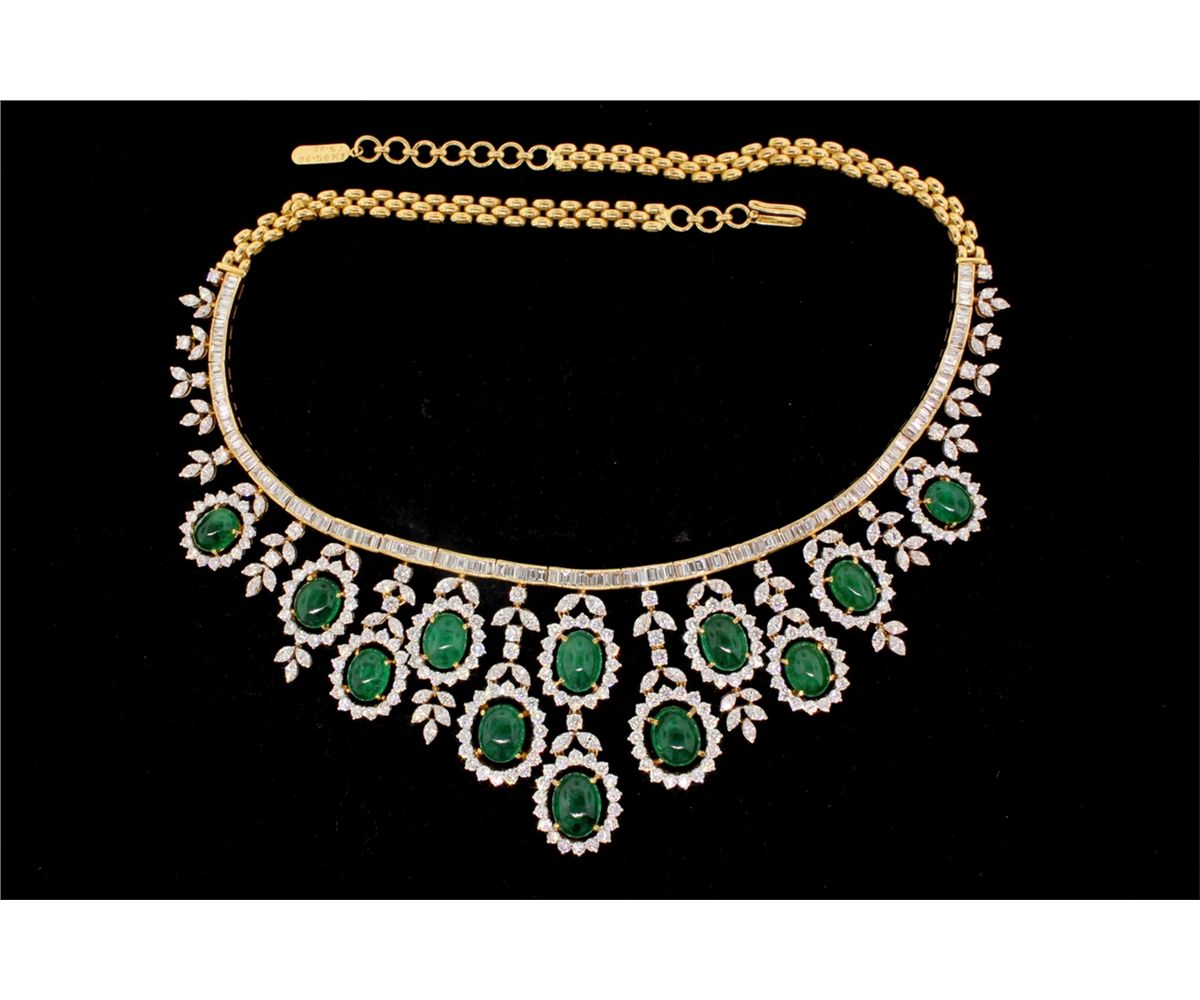 NECKLACE: [1] 18kyg emerald and dia necklace set with (12) oval emerald cabochons commercial to good quality, 35.90cttw, (123) baguette dias 5.02cttw, (294) rbc dias 11.22cttw, (83) marquise dias 6.85cttw, VS2-SI1 clarity, G-H color. 19" long. 85g.