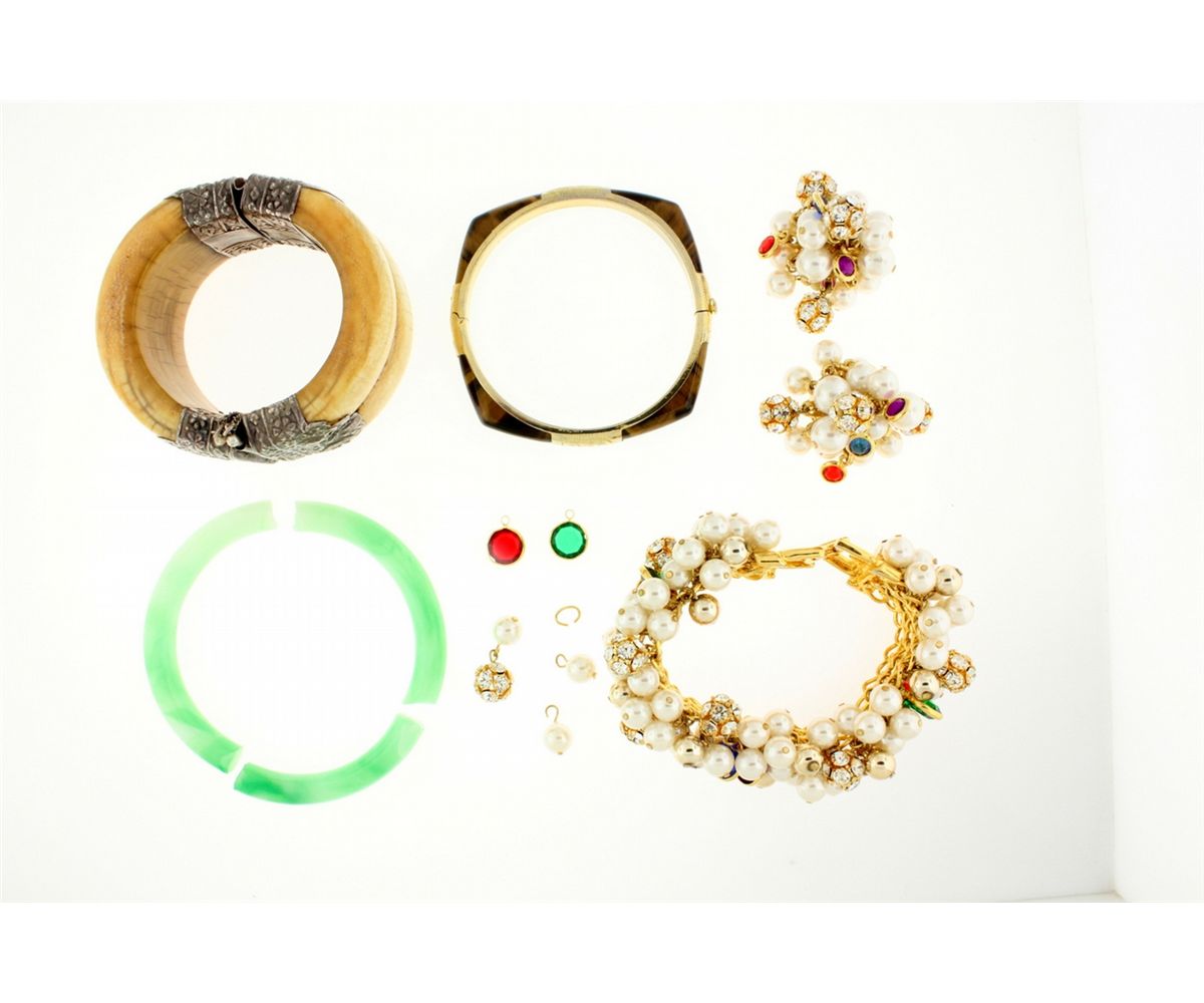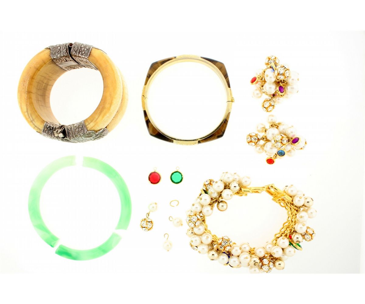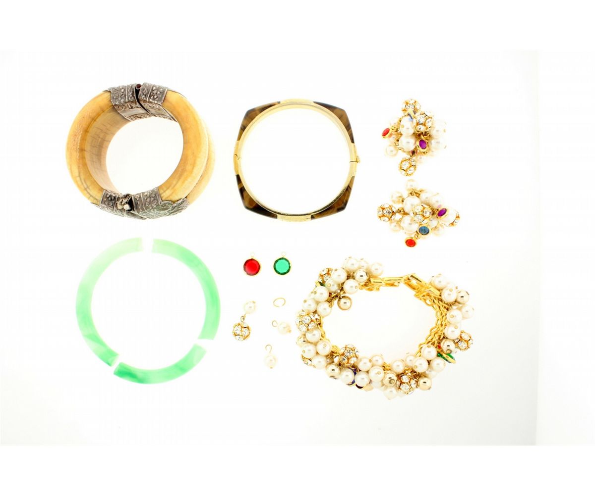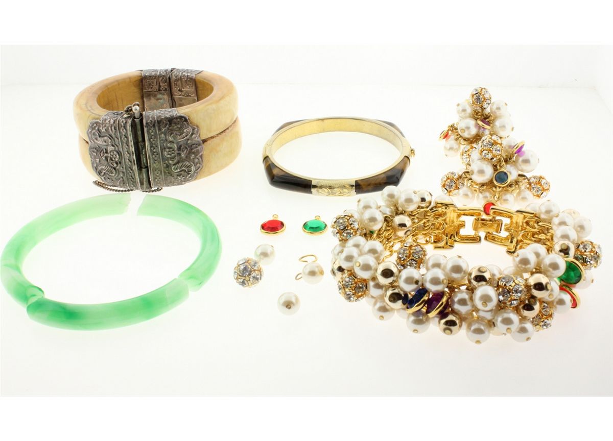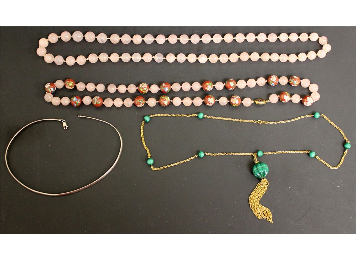 NECKLACE: [1] Gold plated chain necklace with 8.0mm malachite beads and a pendant with a melon carved malachite bead and a tassel of gold plated chain; 26''s (The pendant bail is gold plated silver).NECKLACE: [1] Single strand of 12 to 15mm rose quartz beads; 32''s (Continuous strand, no clasp).COSTUME JEWELRY: [1] Gold plated bracelet with faux pearls, assorted synthetic colored stones and clear rhinestones, 7''s.COSTUME JEWELRY: [1 pair] Gold plated earrings with faux pearls, assorted synthetic colored stones and clear rhinestones.COSTUME JEWELRY: [1] Gold plated pieces with faux pearls, assorted synthetic colored stones and clear rhinestones.BRACELET: [1] Silver and bone hinged bangle bracelet. Safety chain is broken. BRACELET: [1] Gold plated hinged bangle bracelet set with pieces of tiger-eye.SCRAP: [1] Broken pieces of a faux jadeite glass bangle bracelet.NECKLACE: [1] Single strand of 12mm rose quartz beads and 14mm cloisonne beads; 30''s; and a gold plated and cloisonne clasp.NECKLACE: [1] Sterling silver Omega chain necklace; 4.1mms wide; 16''s; 19.2 grams.