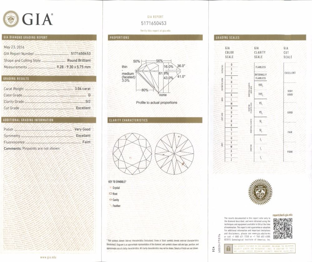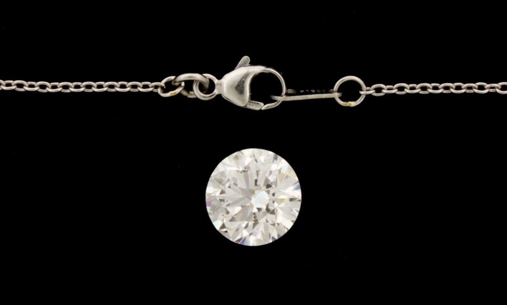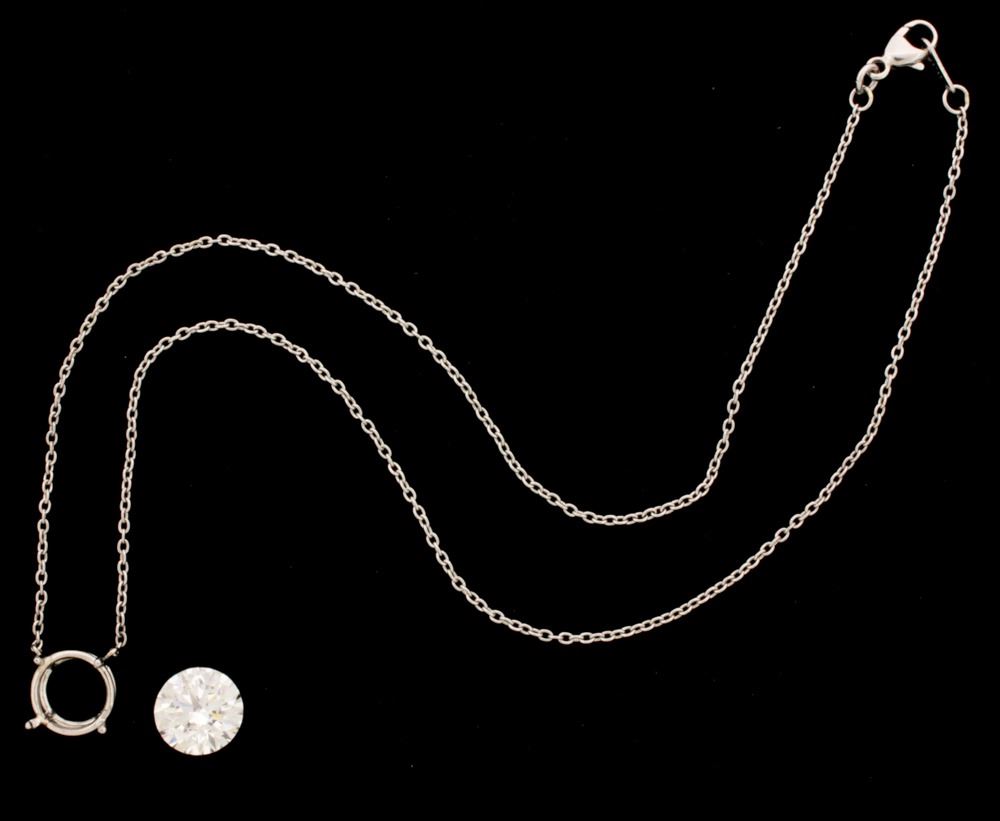 NECKLACE: [1] Platinum rolo chain necklace with a center setting set with a round brilliant cut diamond, 9.28 - 9.30 x 5.75mms = approx. 3.04 cts., D. SI2, faint fluorescence, GIA Report #5171650453 (5/23/16/); 14 1/2"s; 4.4 grams