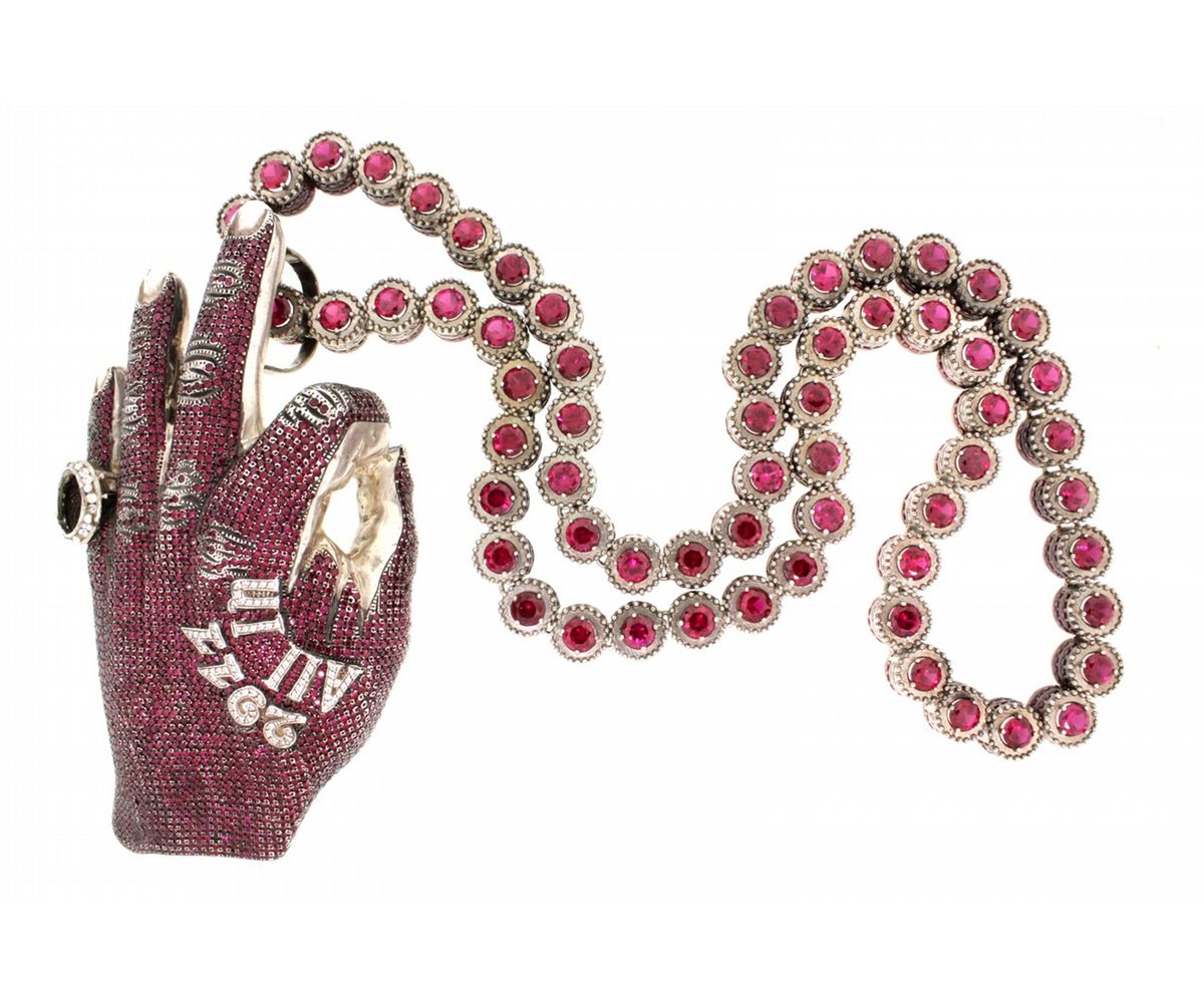 NECKLACE: [1] Silver (acid tested) necklace set with synthetic red stones and 310 rd diamonds, approx. 15.5cttw., H-J, good-fair / SI2-I3, 40"s; and [1] silver (acid tested) life size hand '2911 ALL IN' pendant set with synthetic red and clear stones, several stones missing); 906.6 grams (Missing center stone in ring on hand.)