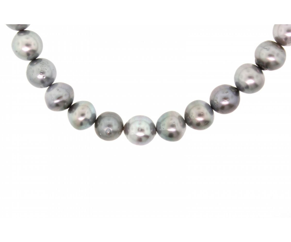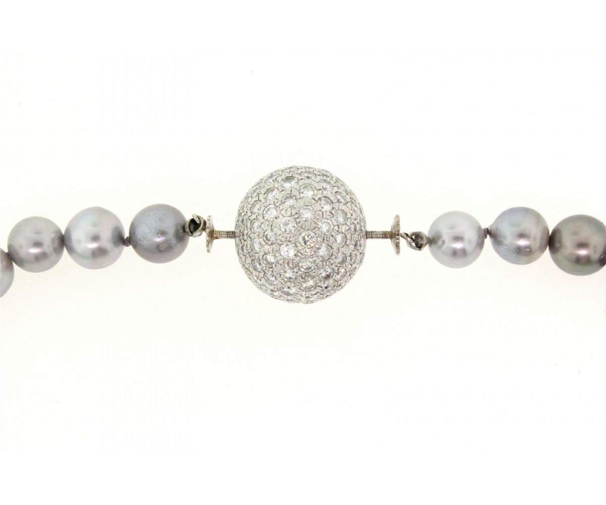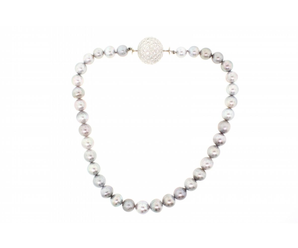 NECKLACE: [1] Strand of cultured Tahitian pearls with diamond and 14kwg ball clasp. (36) 9.0 - 9.5mm off round silver-gray cultured pearls of commercial quality strung on gray silk, 15'' long. Ball clasp is 20mm diameter set with (120) rbc dias VS clarity, H-I color, approx. 3.00cttw.