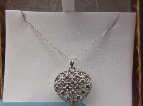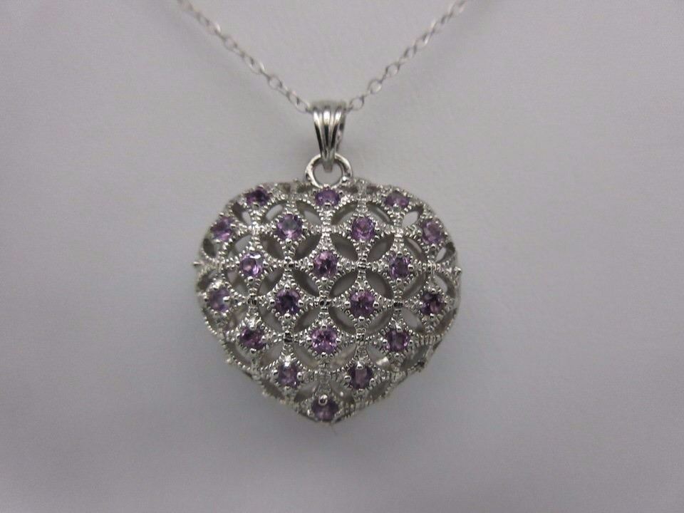 NECKLACE - 20 ROUND FACETED AMETHYST IN STERLING SILVER 3D HEART SETTING - RETAIL ESTIMATE $300