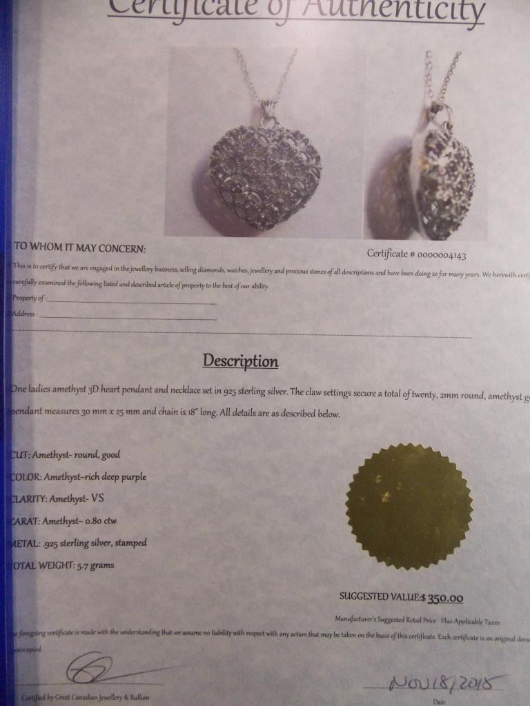 NECKLACE - 20 ROUND FACETTED AMETHYST IN STERLING SILVER 3D PUFF HEART DESIGN - INCLUDES CERTIFICATE $350 - W-13