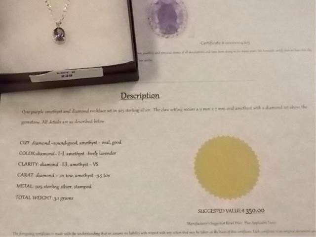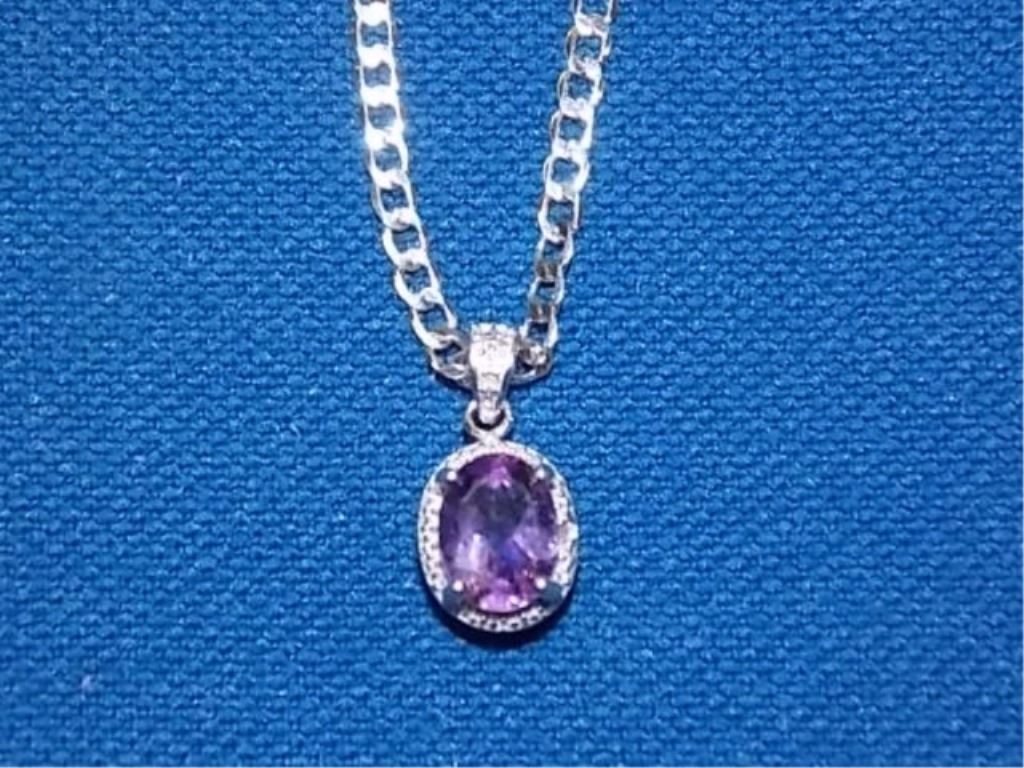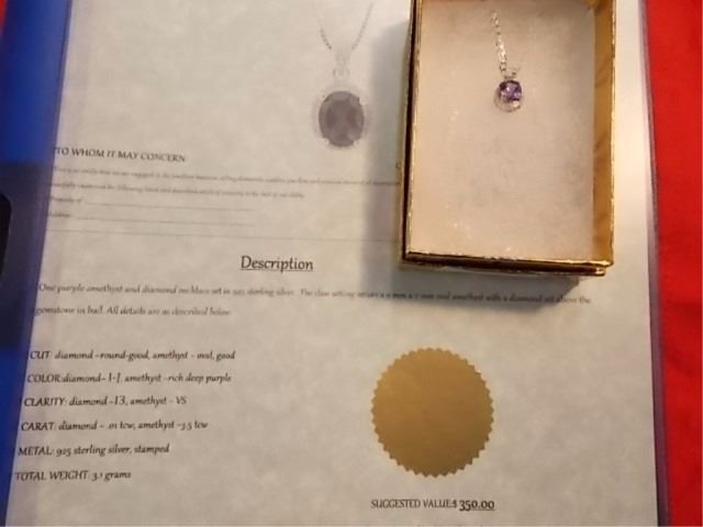 NECKLACE - 3.5CT OVAL FACETED AMETHYST & DIAMOND IN STERLING SILVER SETTING - INLCUDES CERTIFICATE $350