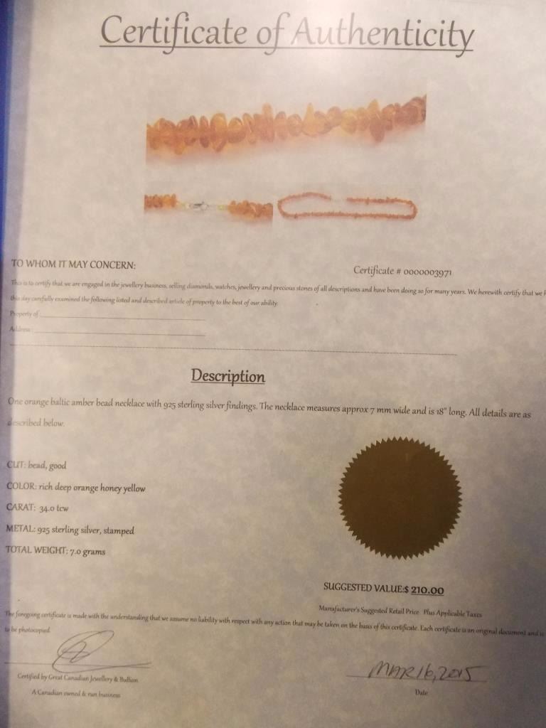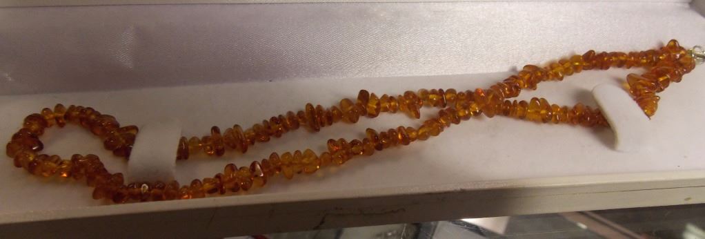 NECKLACE- BALTIC AMBER BALTIC AMBER GEMS TOTALLING 34CT - STERLING SILVER CLASP & FINDINGS - INCLUDES CERTIFICATE $210 - W-42