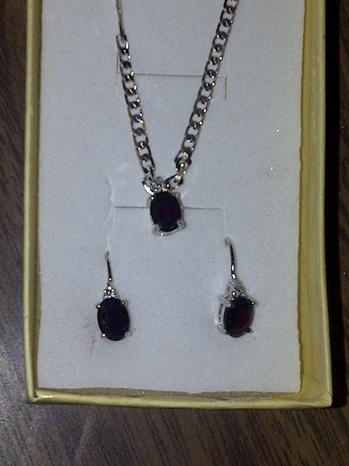 NECKLACE & EARRING 3PC SET - 3TCW OVAL FACETTED DEEP RED BROWN GARNET & ROUND FACETTED DIAMOND IN STAMPED 925 STERLING SILVER SETTING - PLATINUM OVERLAY - INCLUDES STERLING SILVER CHAIN - INCLUDES CERTIFICATE $360 (W-20)