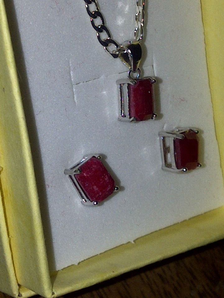 NECKLACE & EARRING 3PC SET - 4TCW EMERALD CUT RUBYS - RICH DEEP RED PURPLE IN STAMPED 925 STERLING SILVER SETTING - PLATINUM OVERLAY - INCLUDES STERLING SILVER CHAIN - INCLUDES CERTIFICATE $300 (W-10)