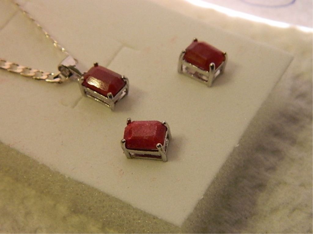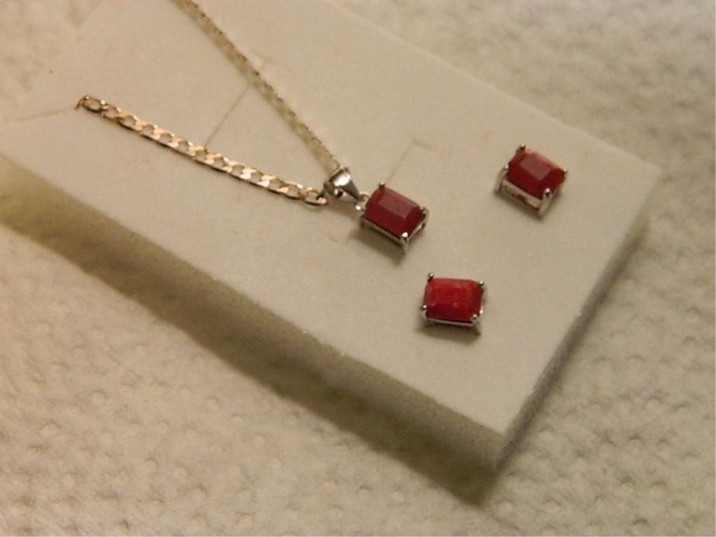 NECKLACE & EARRING 3PC SET - 4TCW EMERALD CUT RUBYS - RICH DEEP RED PURPLE IN STAMPED 925 STERLING SILVER SETTING - PLATINUM OVERLAY - INCLUDES STERLING SILVER CHAIN - INCLUDES CERTIFICATE $300 (W-10)