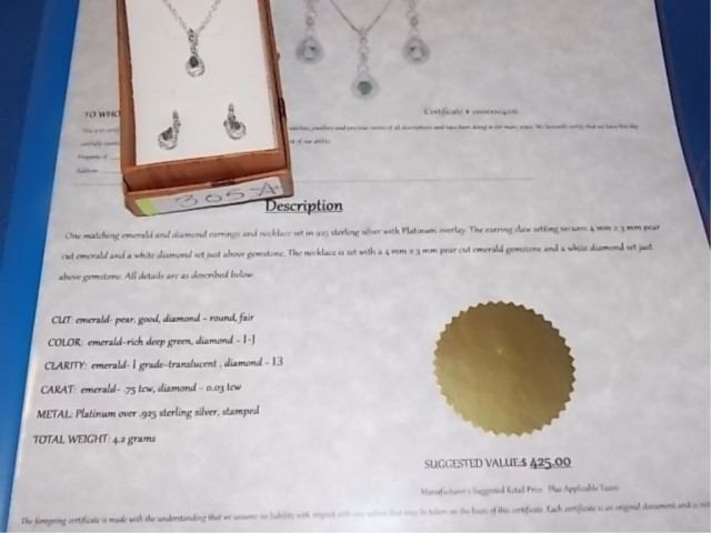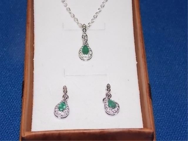 NECKLACE & EARRINGS - NEW PEAR FACETED EMERALD & DIAMONDS IN STERLING SILVER SETTING - INCLUDES CERTIFICATE $425
